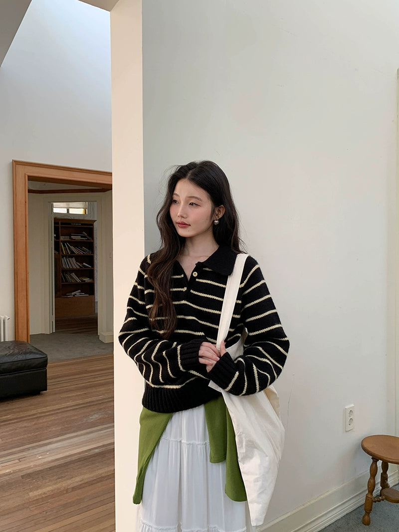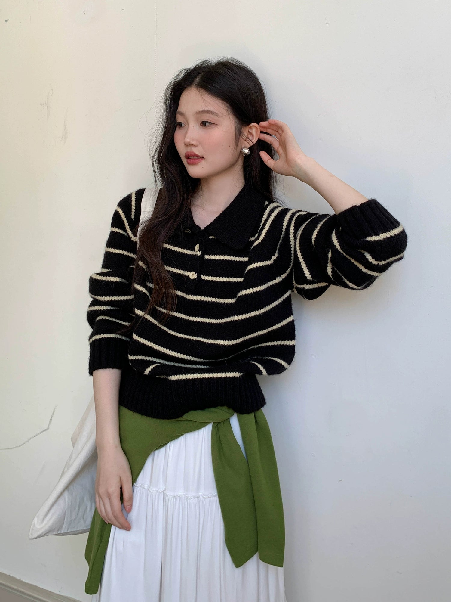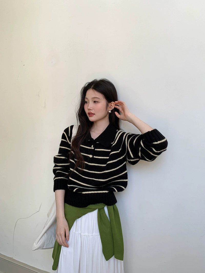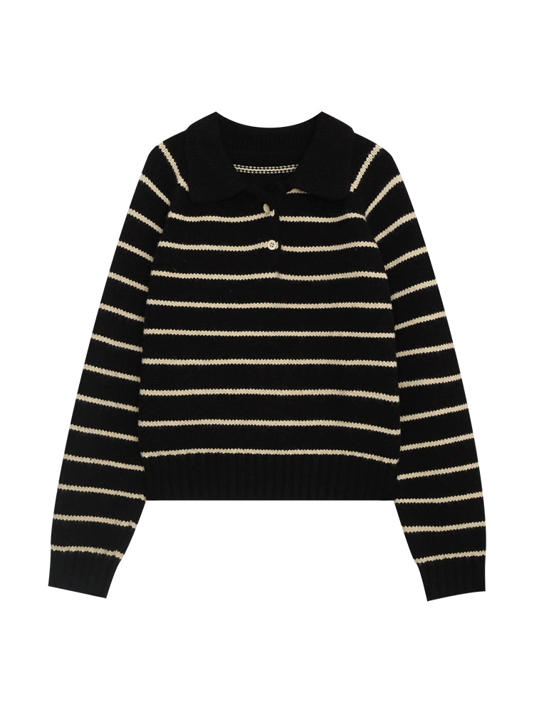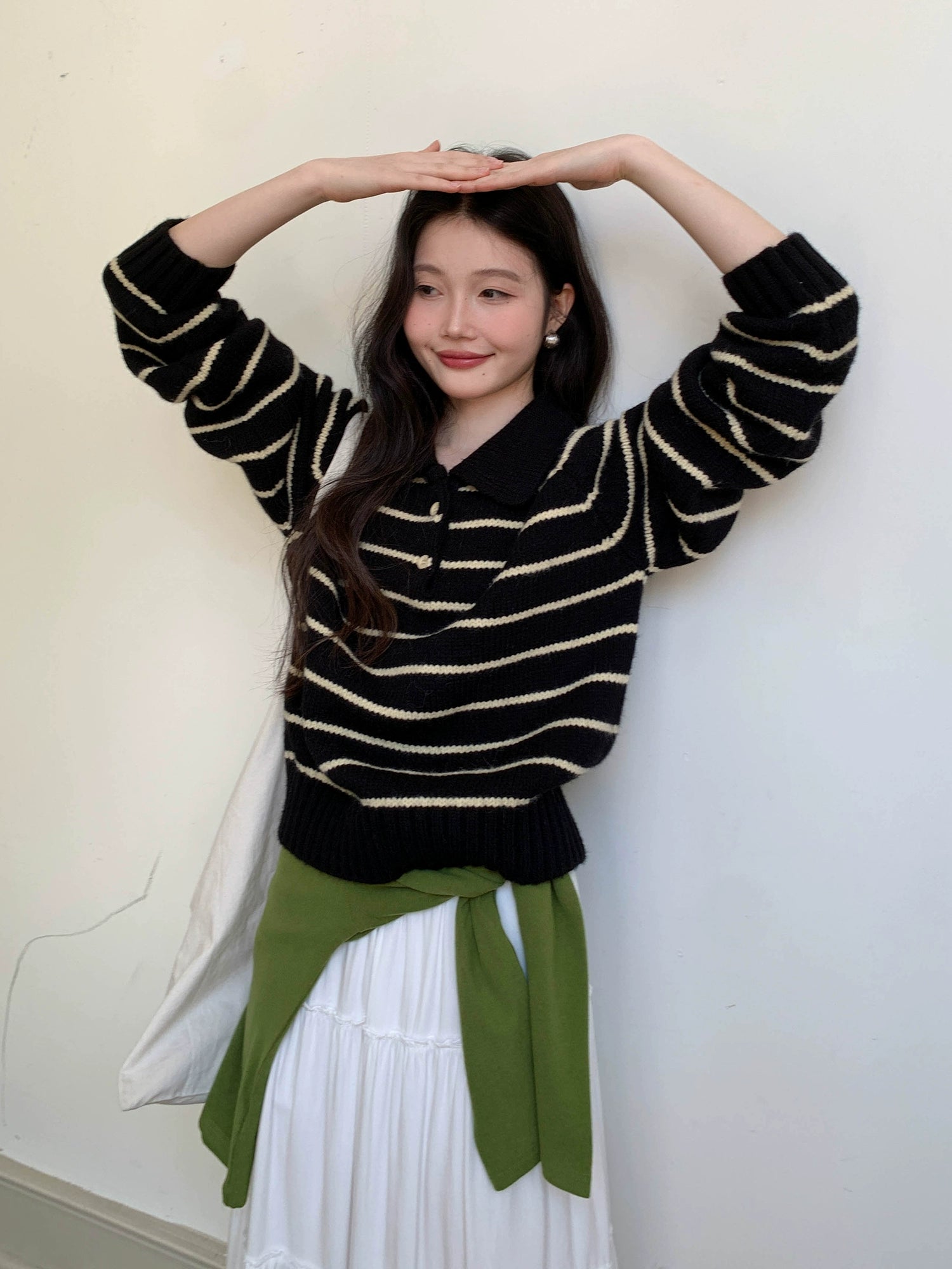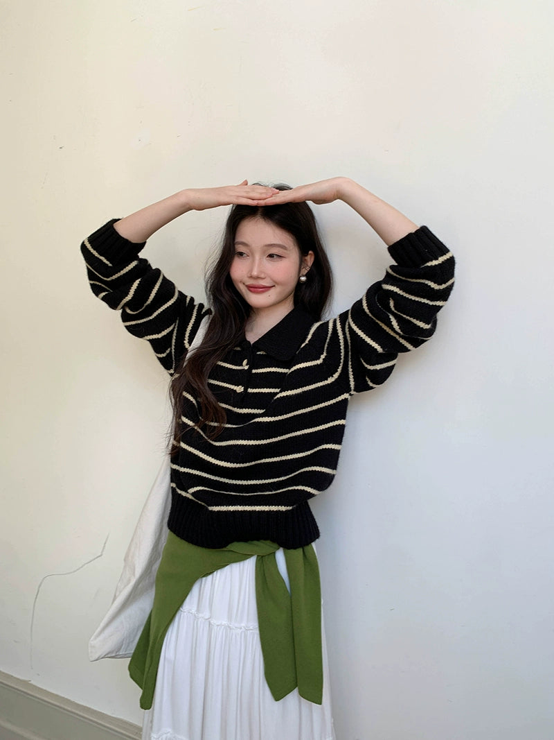 黒とアイボリーのストライプが特徴的なカジュアルなポロセーター。柔らかな素材感とリラックスしたシルエットが際立ち、落ち着いたコーディネートに最適です。色調は落ち着きがあり、プレッピーな印象も与えます。襟元とボタンデザインがさりげないアクセントになり、スタイリッシュさを演出。どんなシーンでも着回しやすく、デイリーユースにぴったりです。