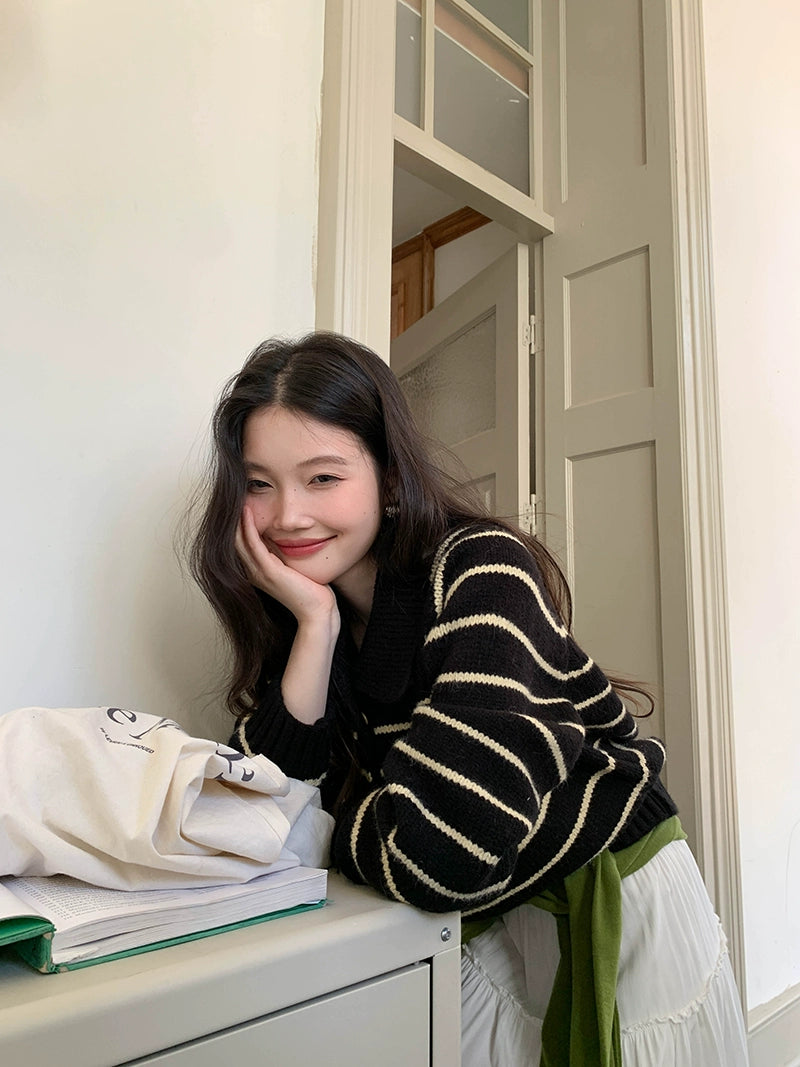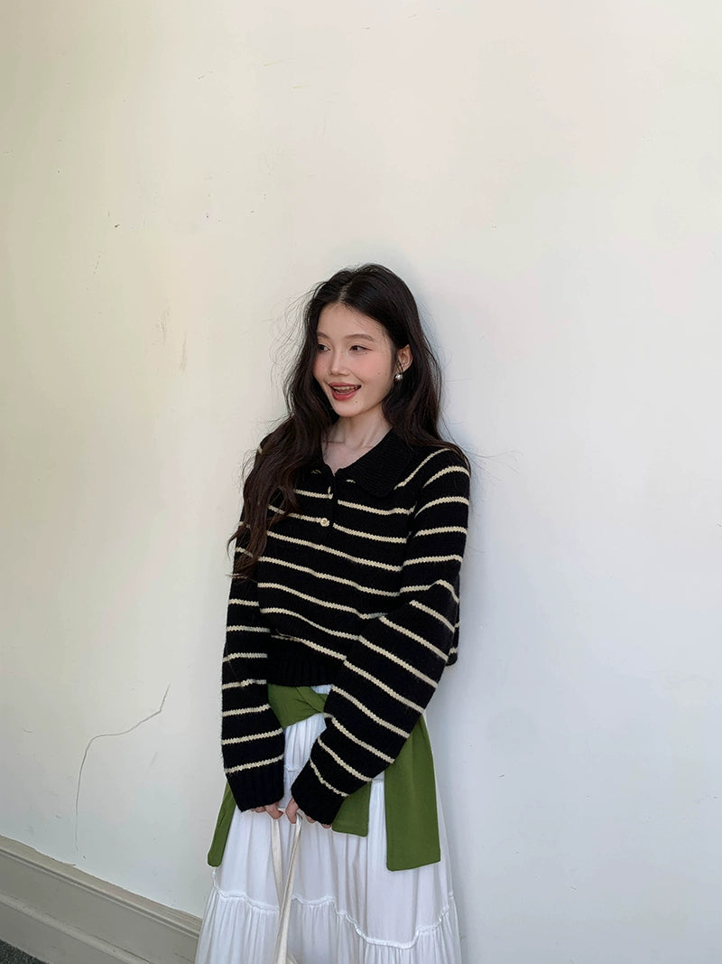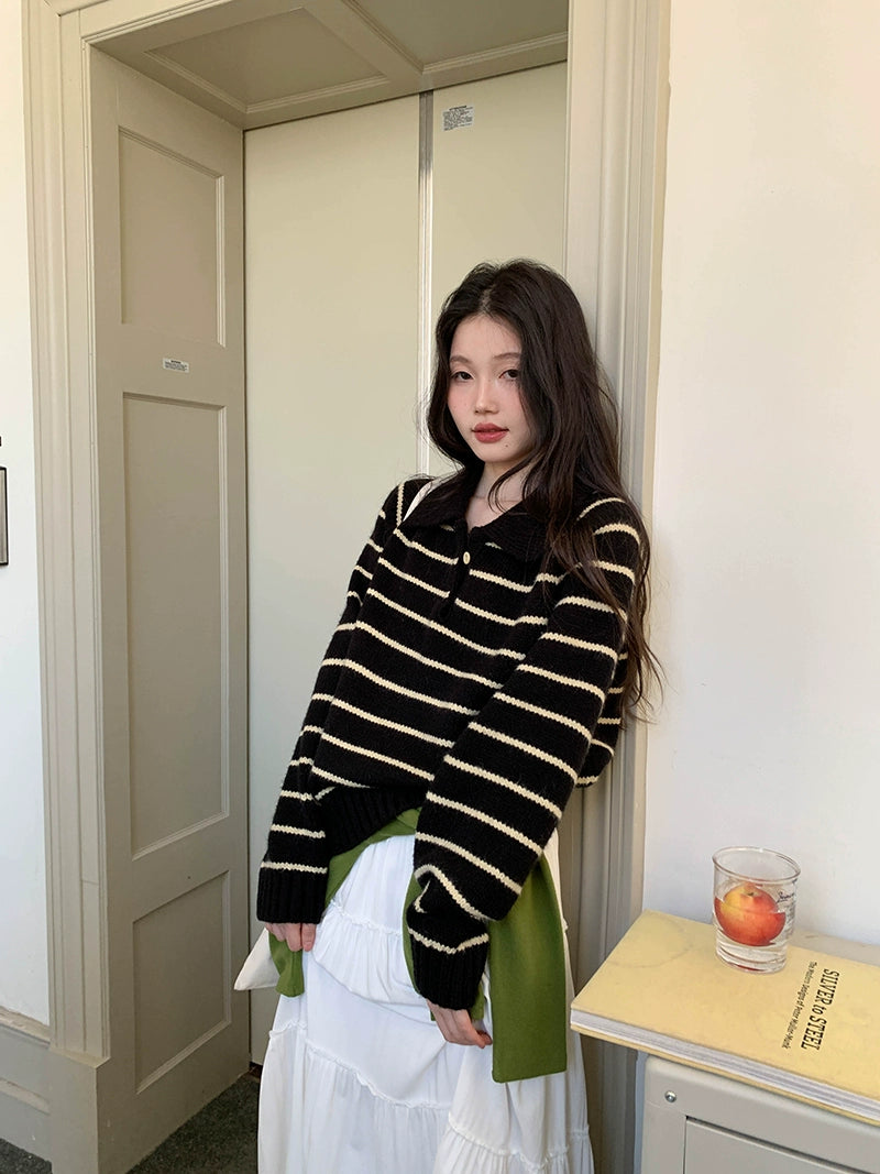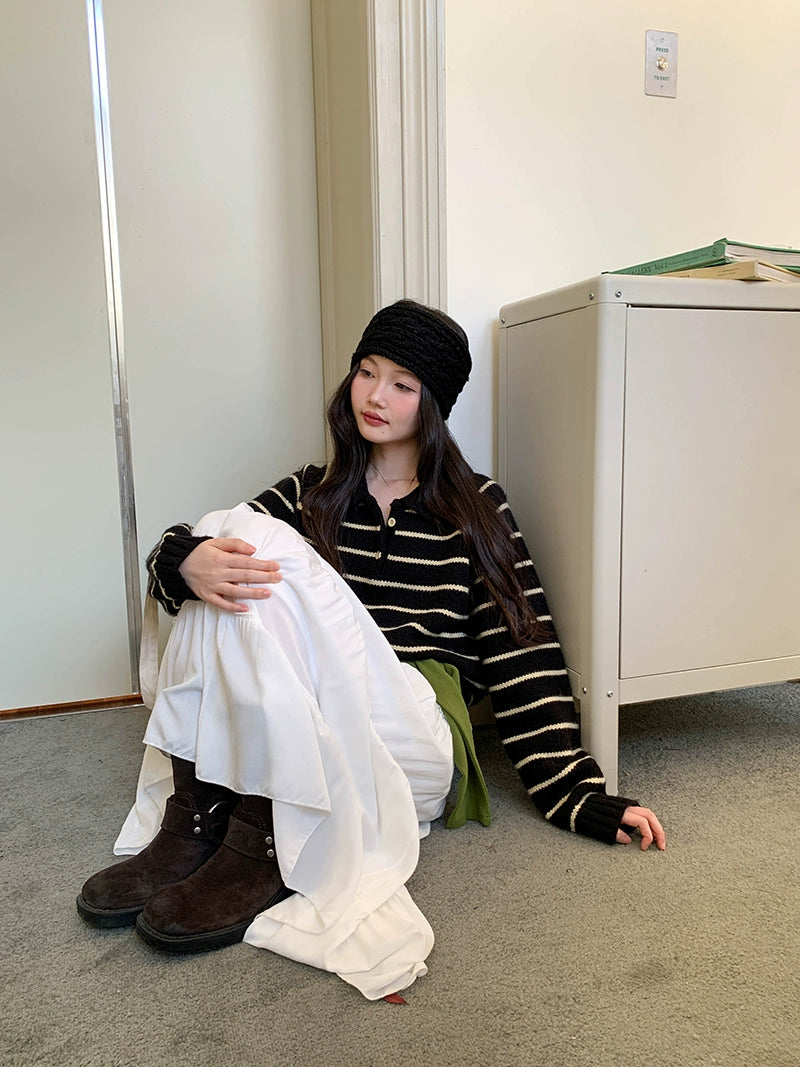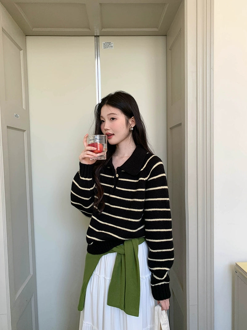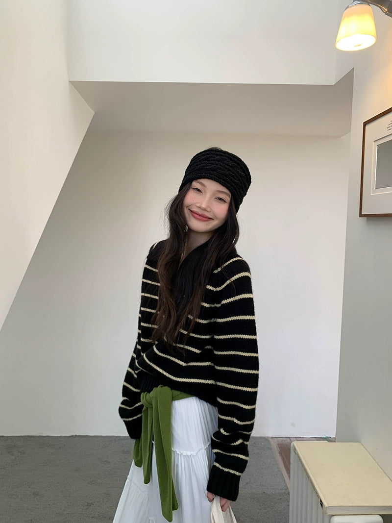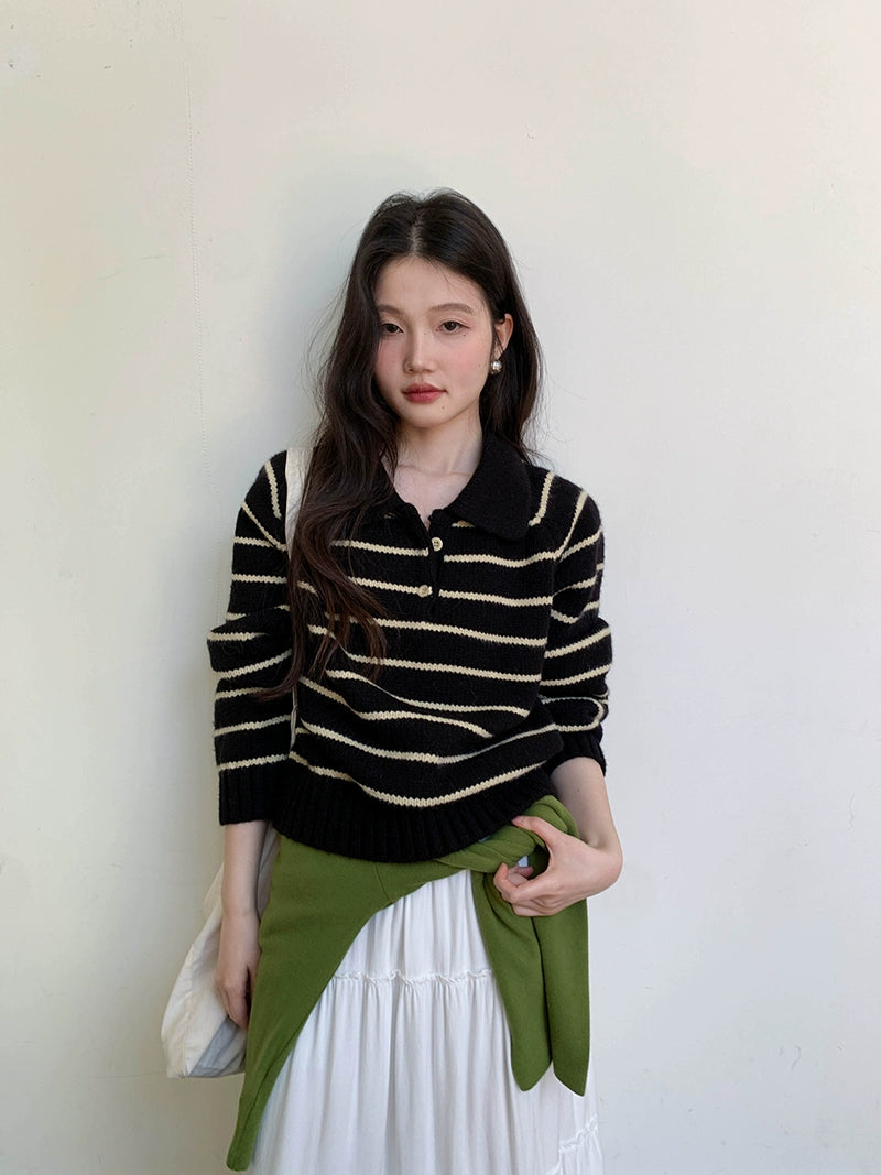 黒とアイボリーのストライプが特徴的なカジュアルなポロセーター。柔らかな素材感とリラックスしたシルエットが際立ち、落ち着いたコーディネートに最適です。色調は落ち着きがあり、プレッピーな印象も与えます。襟元とボタンデザインがさりげないアクセントになり、スタイリッシュさを演出。どんなシーンでも着回しやすく、デイリーユースにぴったりです。