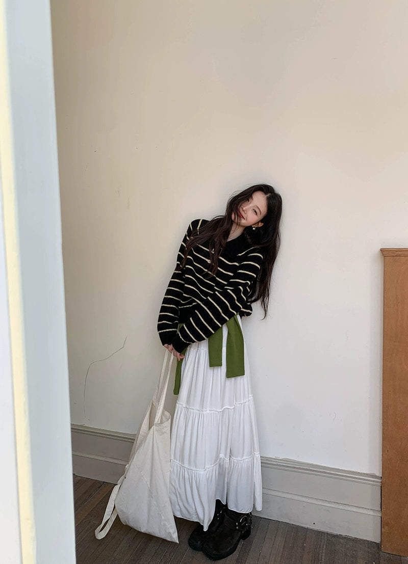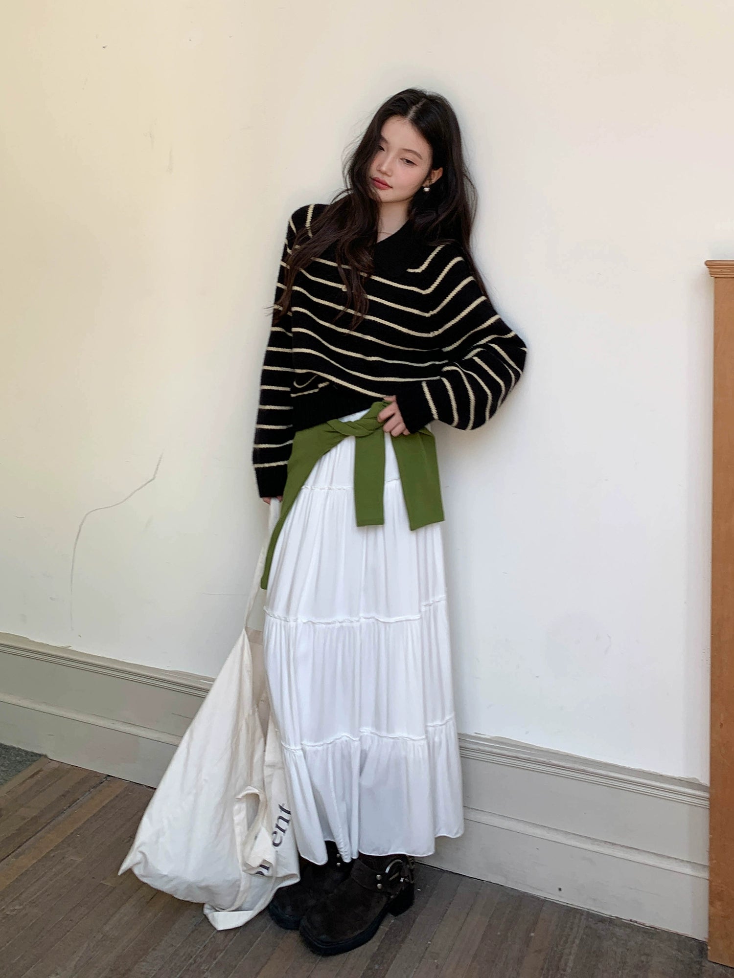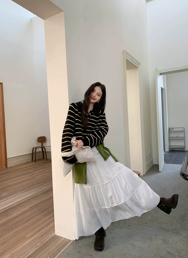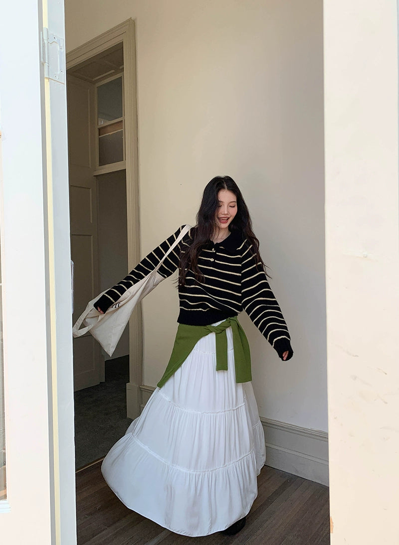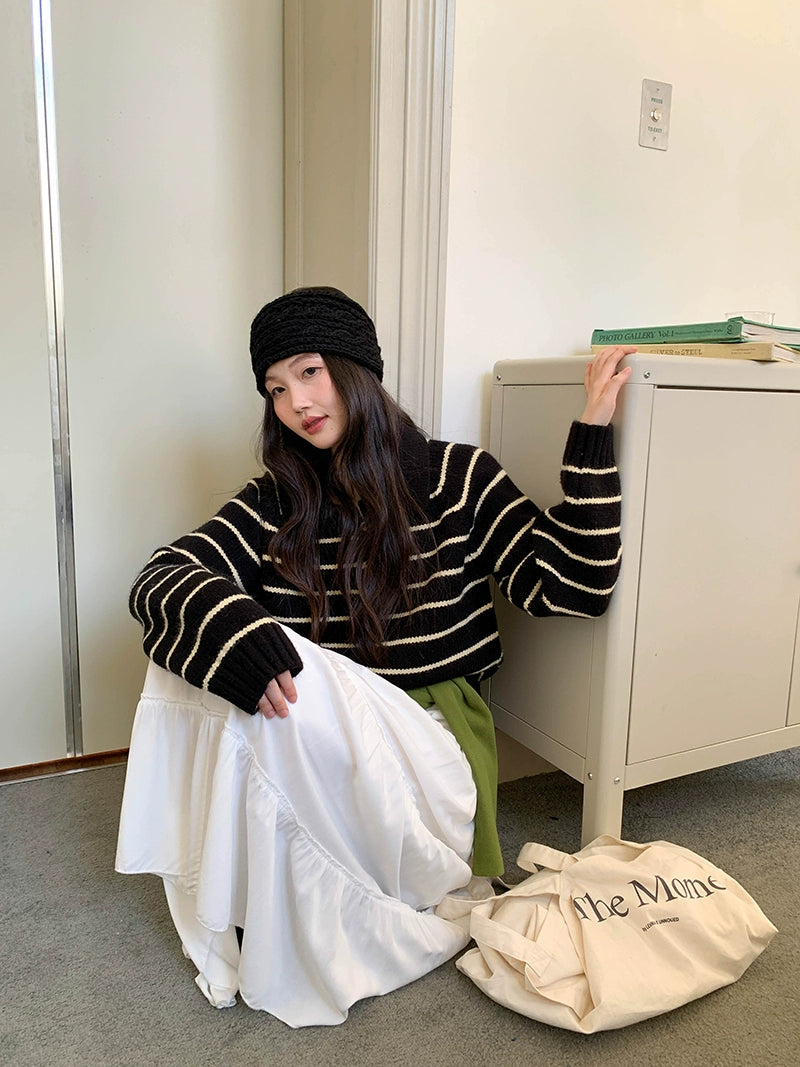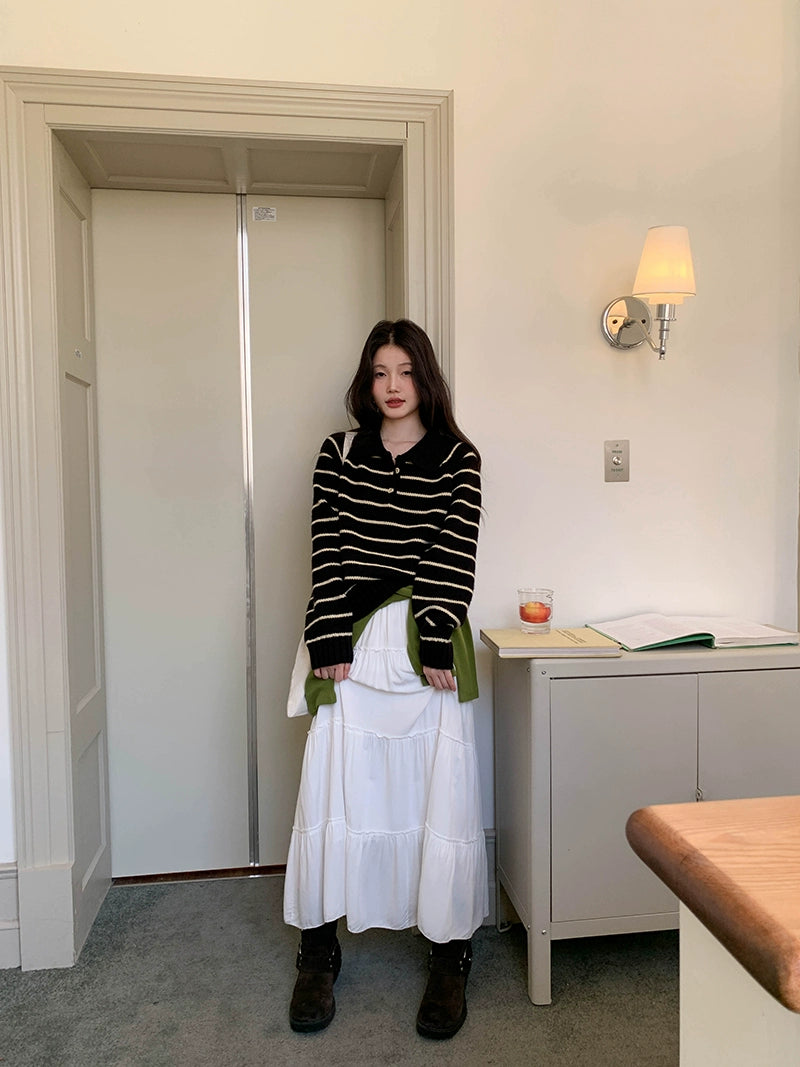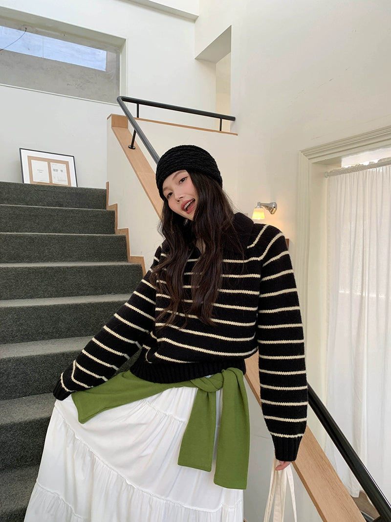 黒とアイボリーのストライプが特徴的なカジュアルなポロセーター。柔らかな素材感とリラックスしたシルエットが際立ち、落ち着いたコーディネートに最適です。色調は落ち着きがあり、プレッピーな印象も与えます。襟元とボタンデザインがさりげないアクセントになり、スタイリッシュさを演出。どんなシーンでも着回しやすく、デイリーユースにぴったりです。