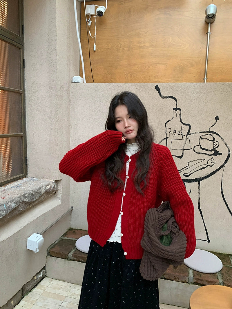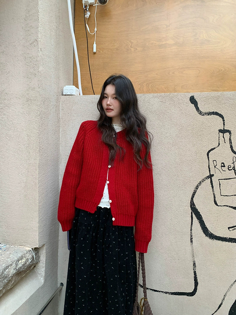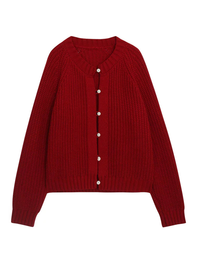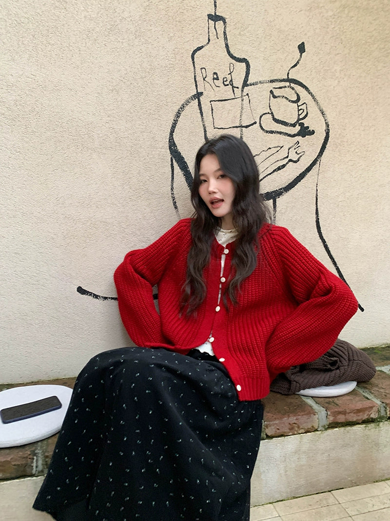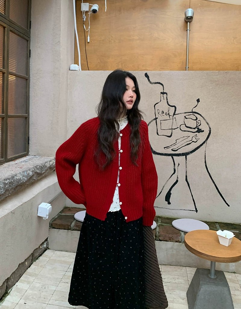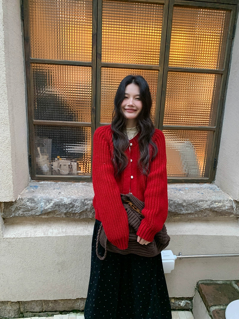 鮮やかな赤色のチャンキー ニット カーディガン。ふわふわとした質感と編み柄が特徴で、リラックスしたシルエットが女性らしさを引き立てます。プラスティック製のボタンがアクセントとなり、さまざまなスタイルに合わせやすく、カジュアルにもフォーマルにもマッチします。日常使いから特別なシーンまで幅広く活躍するアイテムです。