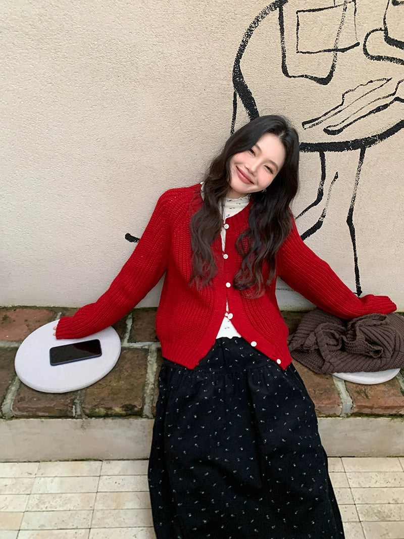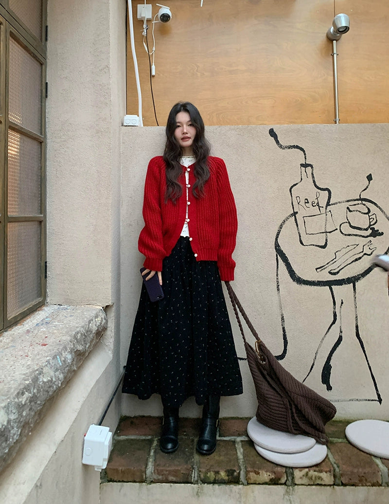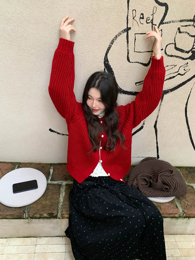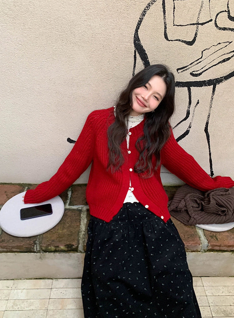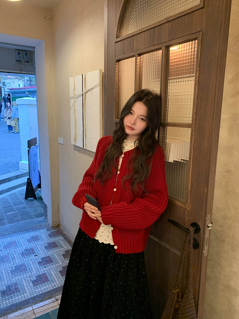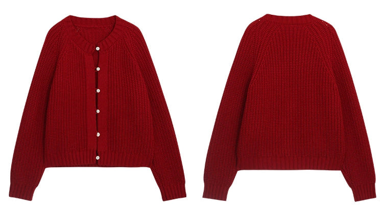 鮮やかな赤色のチャンキー ニット カーディガン。ふわふわとした質感と編み柄が特徴で、リラックスしたシルエットが女性らしさを引き立てます。プラスティック製のボタンがアクセントとなり、さまざまなスタイルに合わせやすく、カジュアルにもフォーマルにもマッチします。日常使いから特別なシーンまで幅広く活躍するアイテムです。