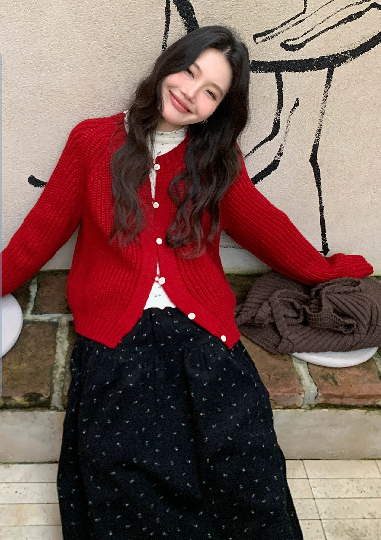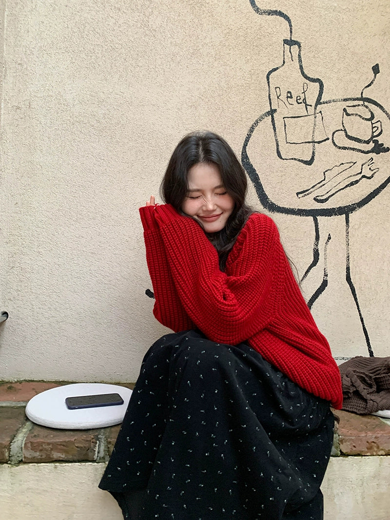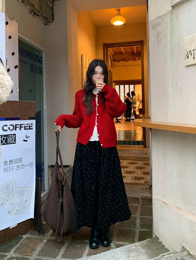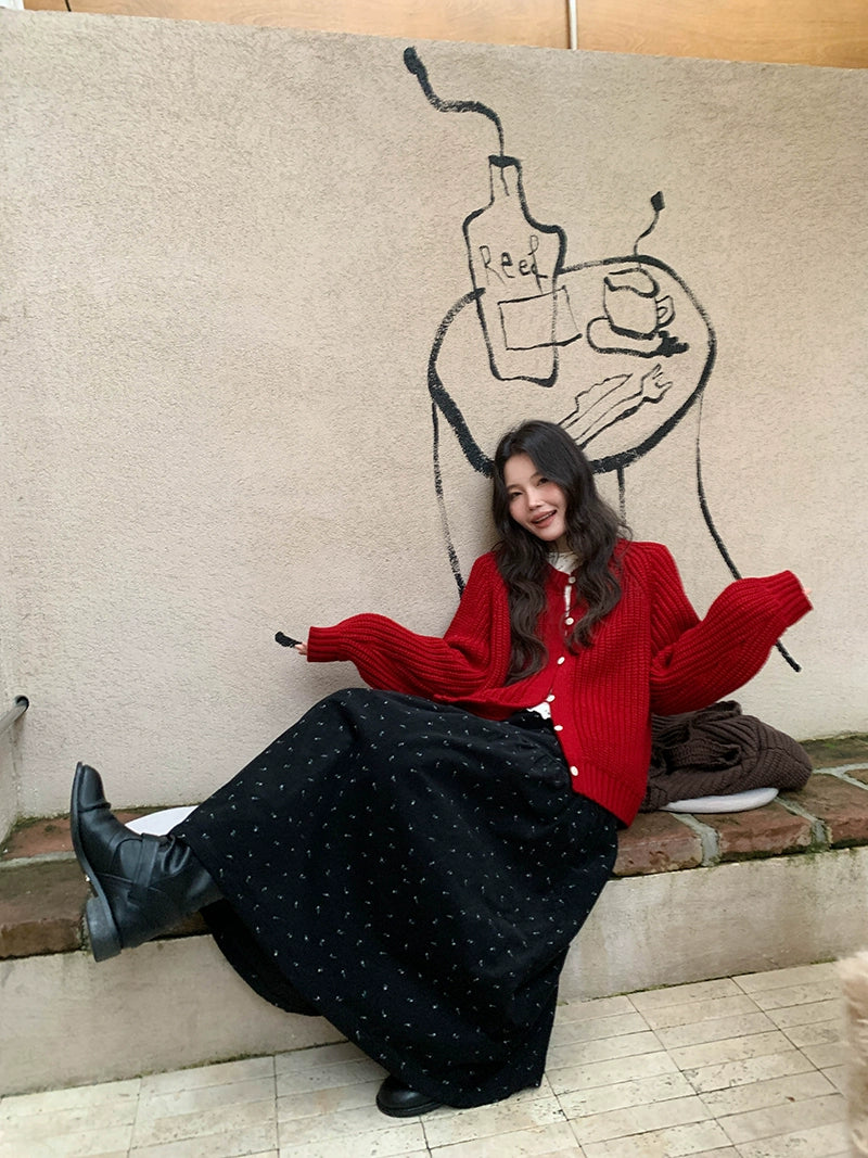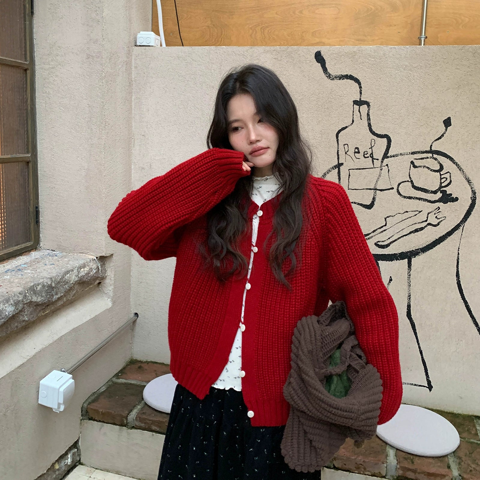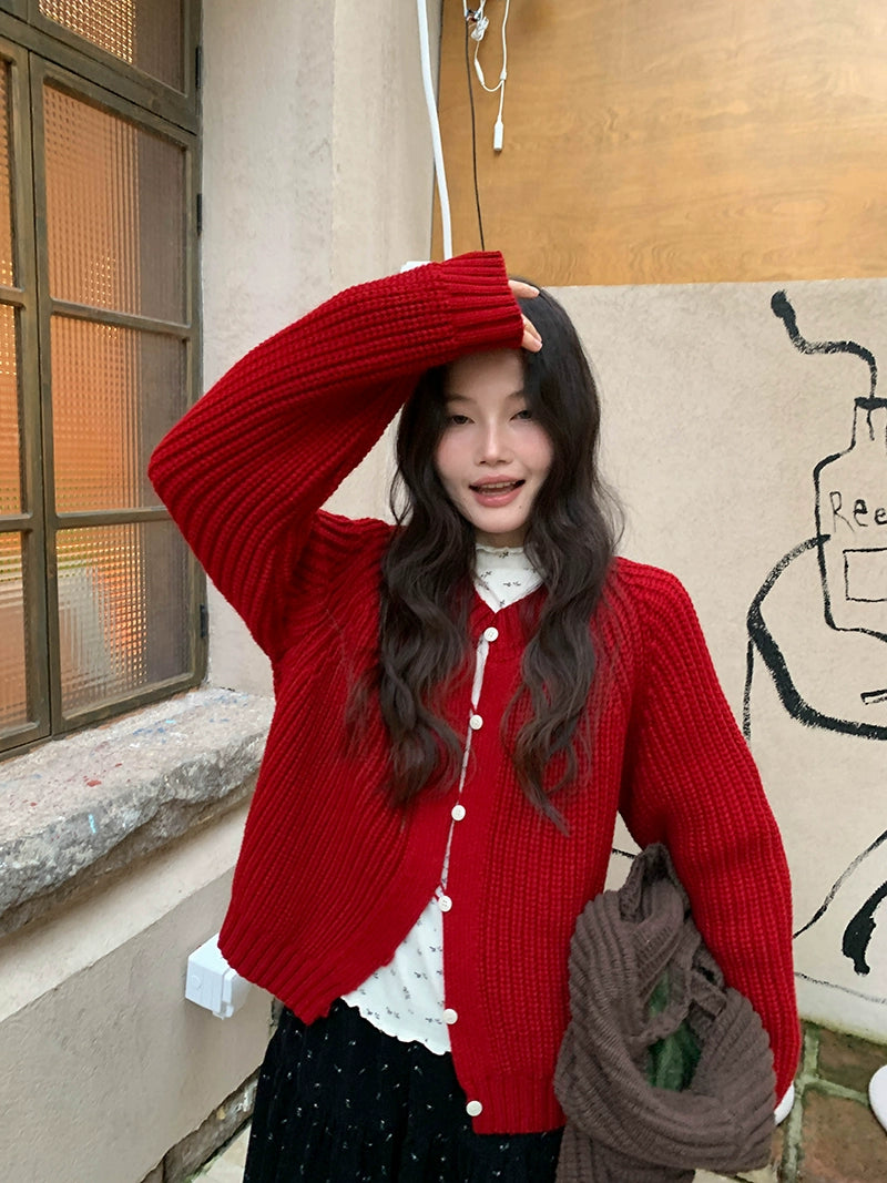 鮮やかな赤色のチャンキー ニット カーディガン。ふわふわとした質感と編み柄が特徴で、リラックスしたシルエットが女性らしさを引き立てます。プラスティック製のボタンがアクセントとなり、さまざまなスタイルに合わせやすく、カジュアルにもフォーマルにもマッチします。日常使いから特別なシーンまで幅広く活躍するアイテムです。