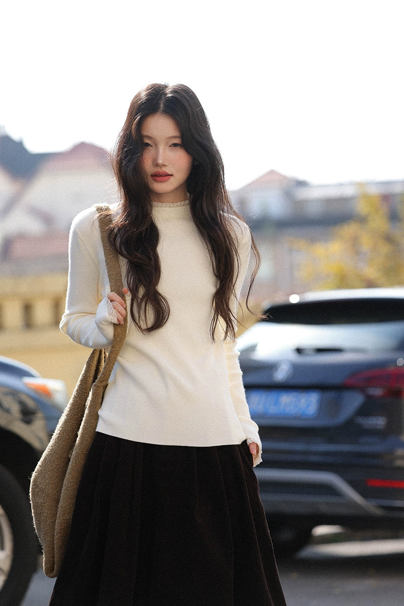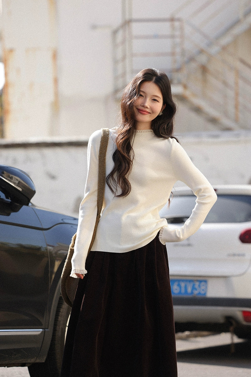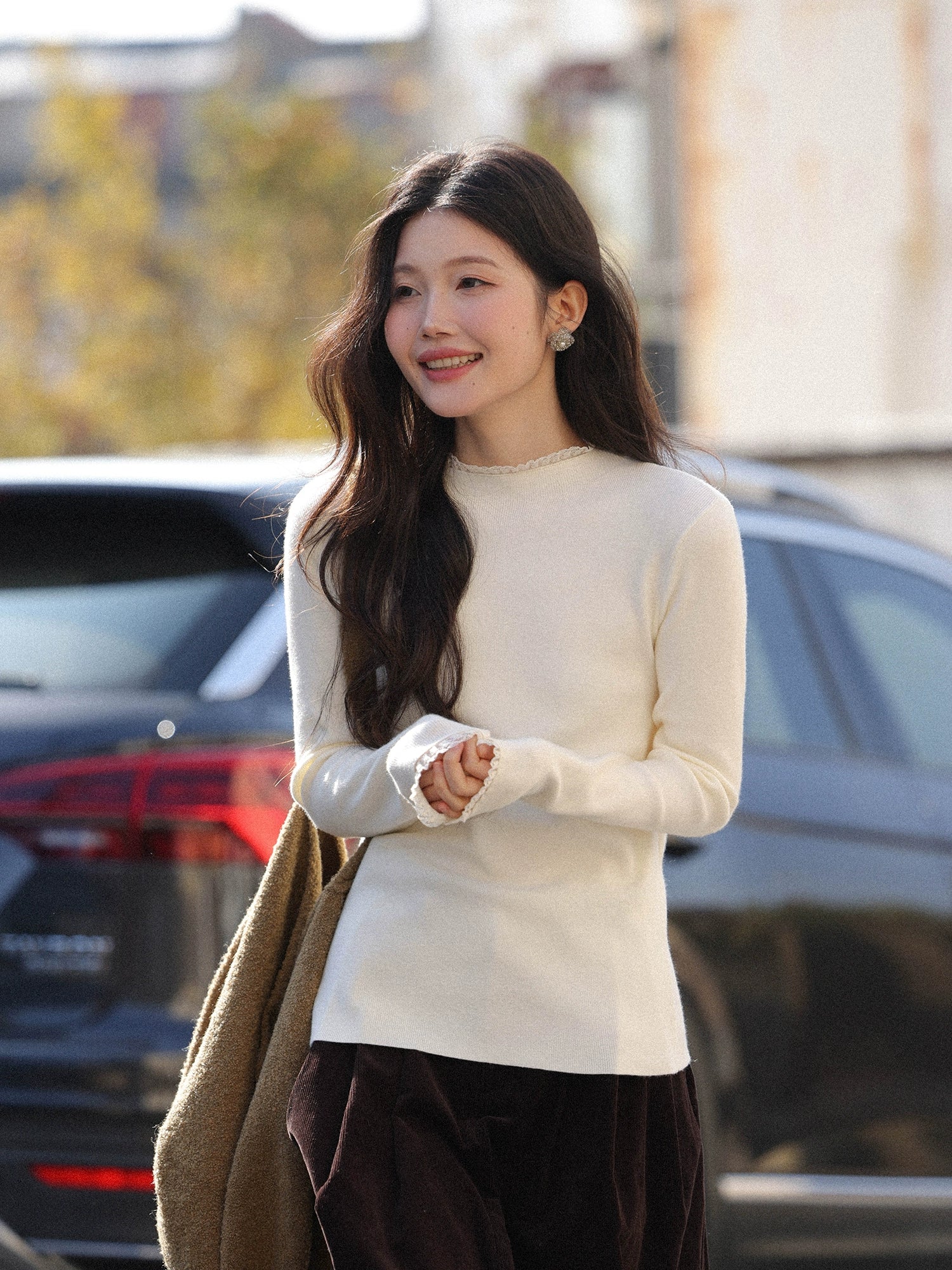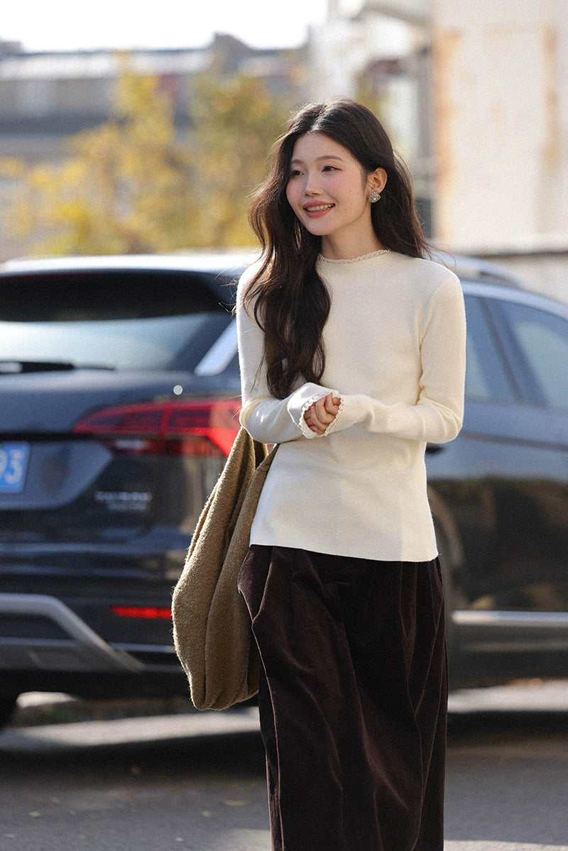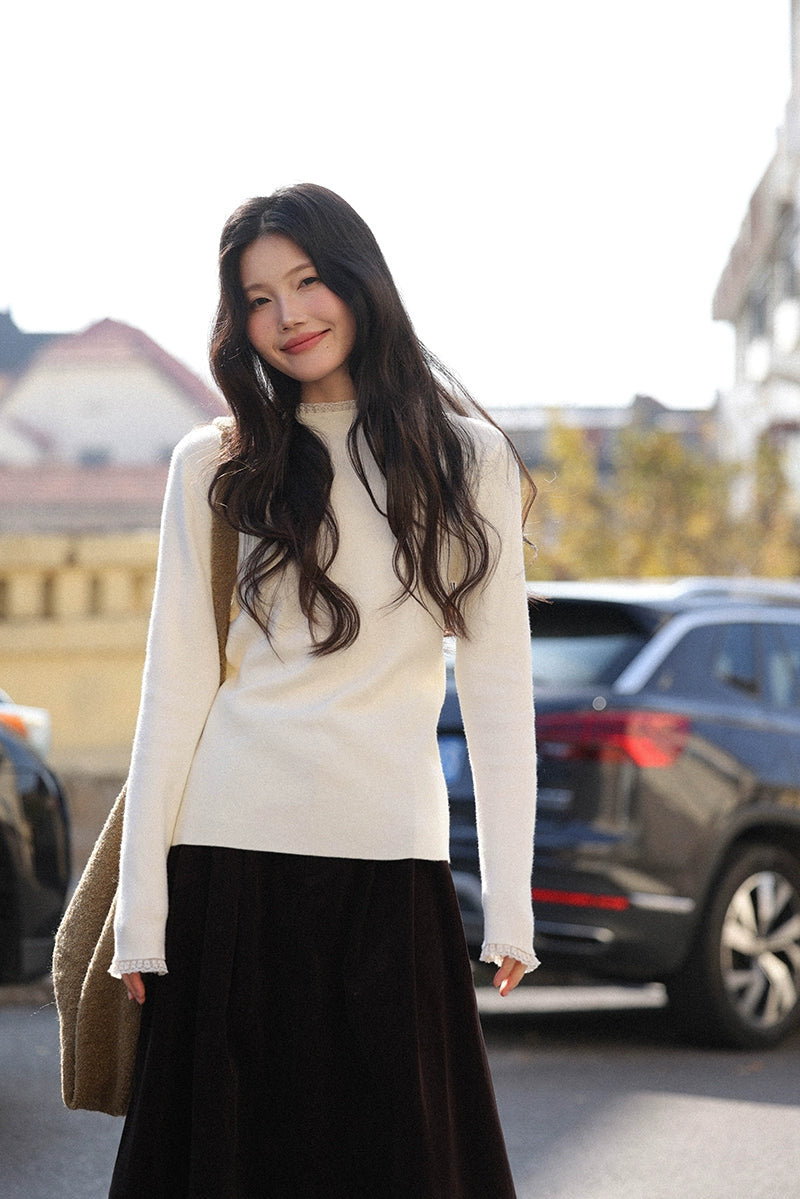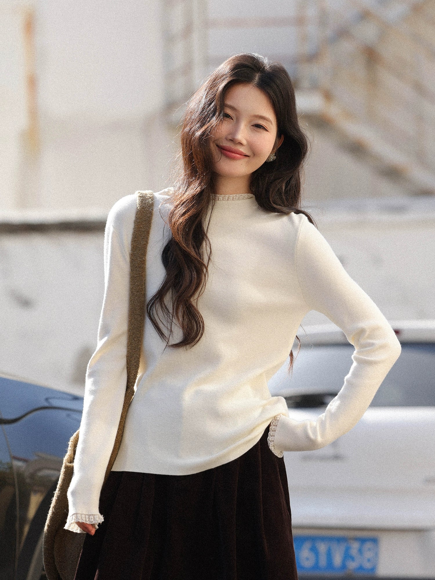 滑らかなコットン素材を使用した上品なセーターは、シンプルなデザインと優しいアイボリーの色合いが特徴。フリルのような首元と袖口のディテールが華やかさを添え、カジュアルからフォーマルまで幅広いシーンで活躍する一着です。