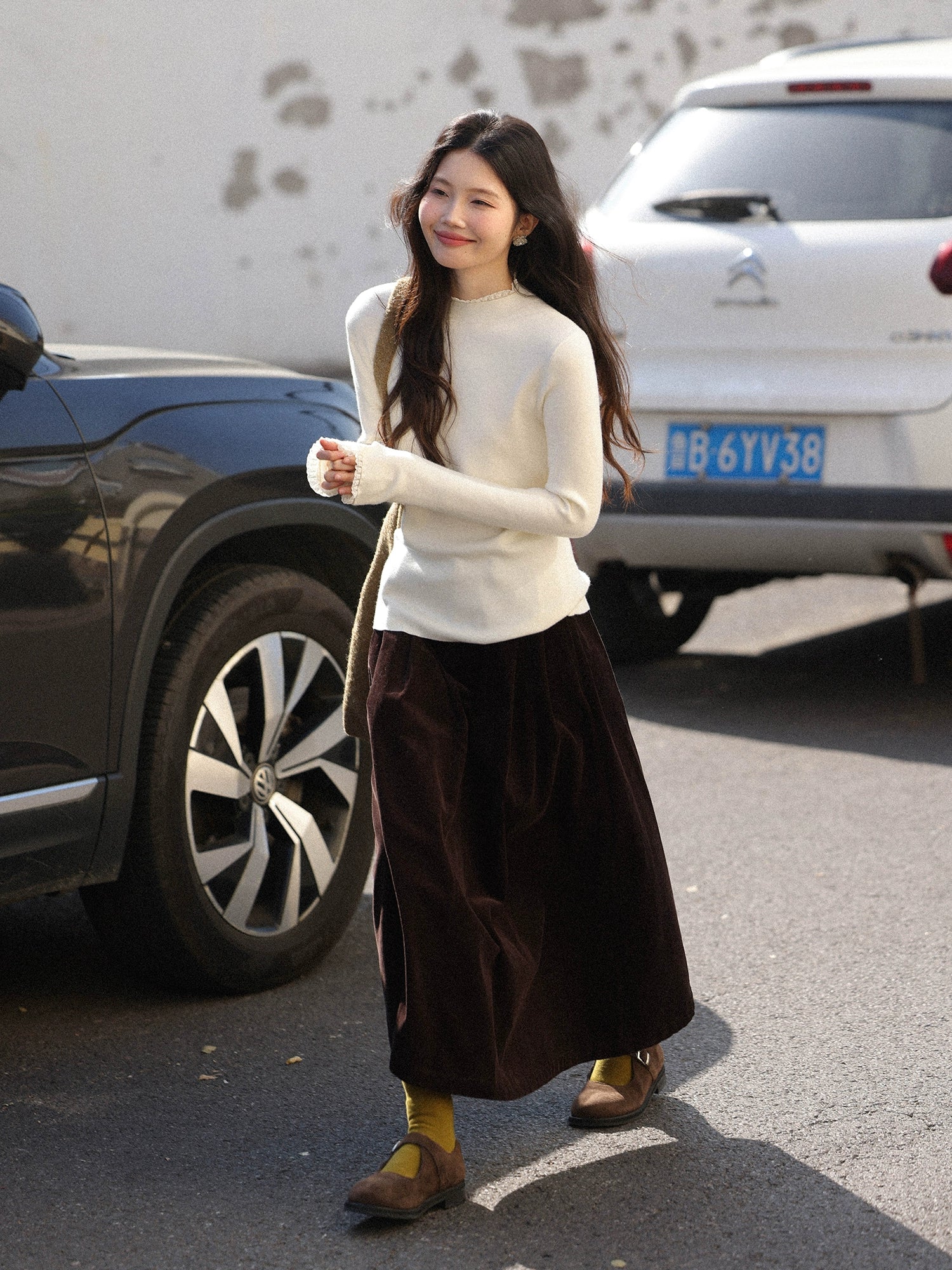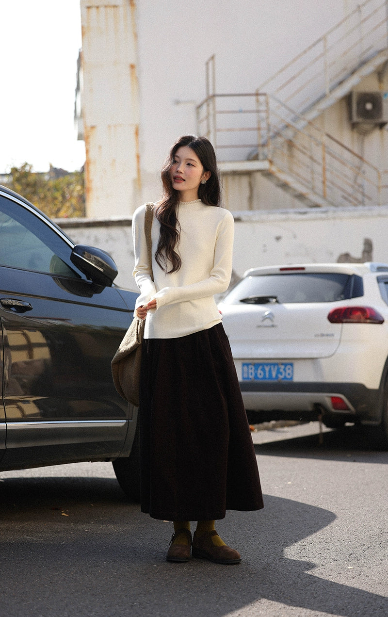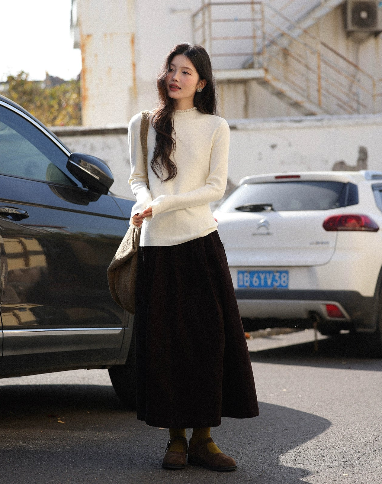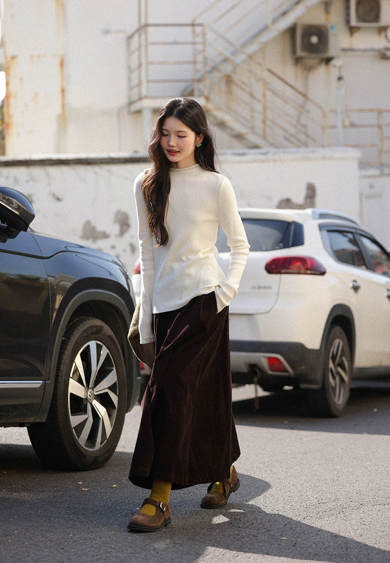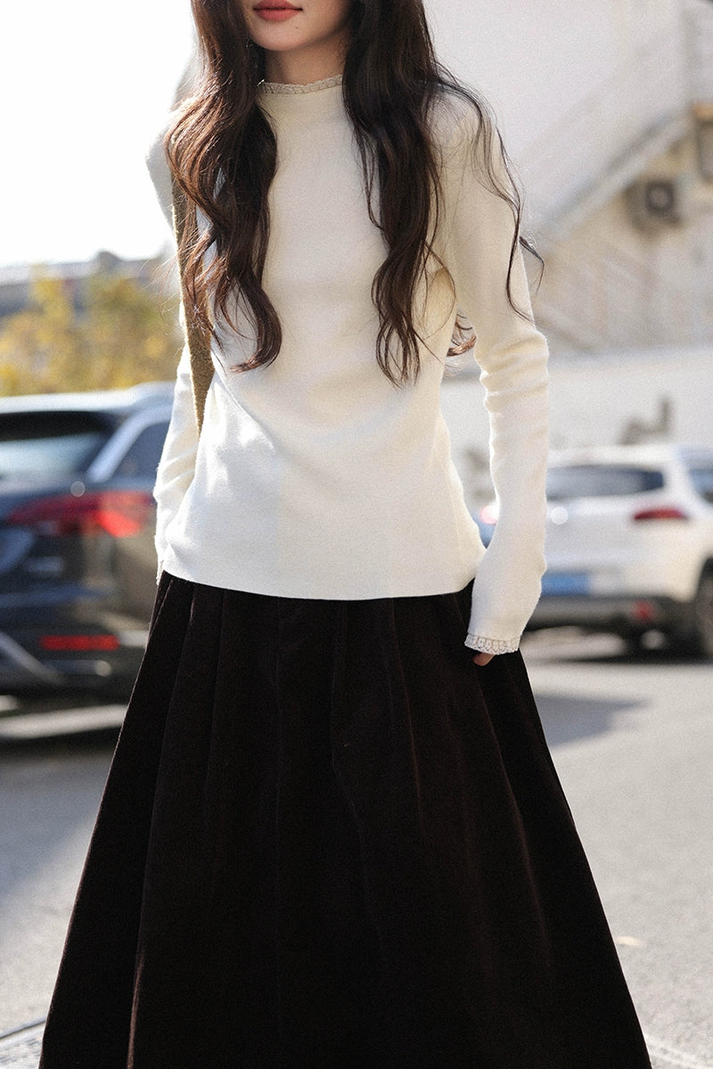滑らかなコットン素材を使用した上品なセーターは、シンプルなデザインと優しいアイボリーの色合いが特徴。フリルのような首元と袖口のディテールが華やかさを添え、カジュアルからフォーマルまで幅広いシーンで活躍する一着です。