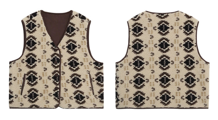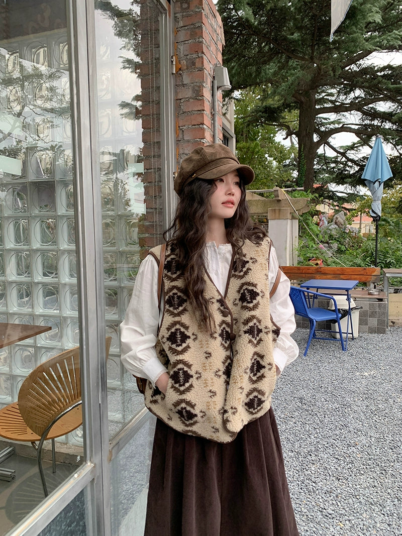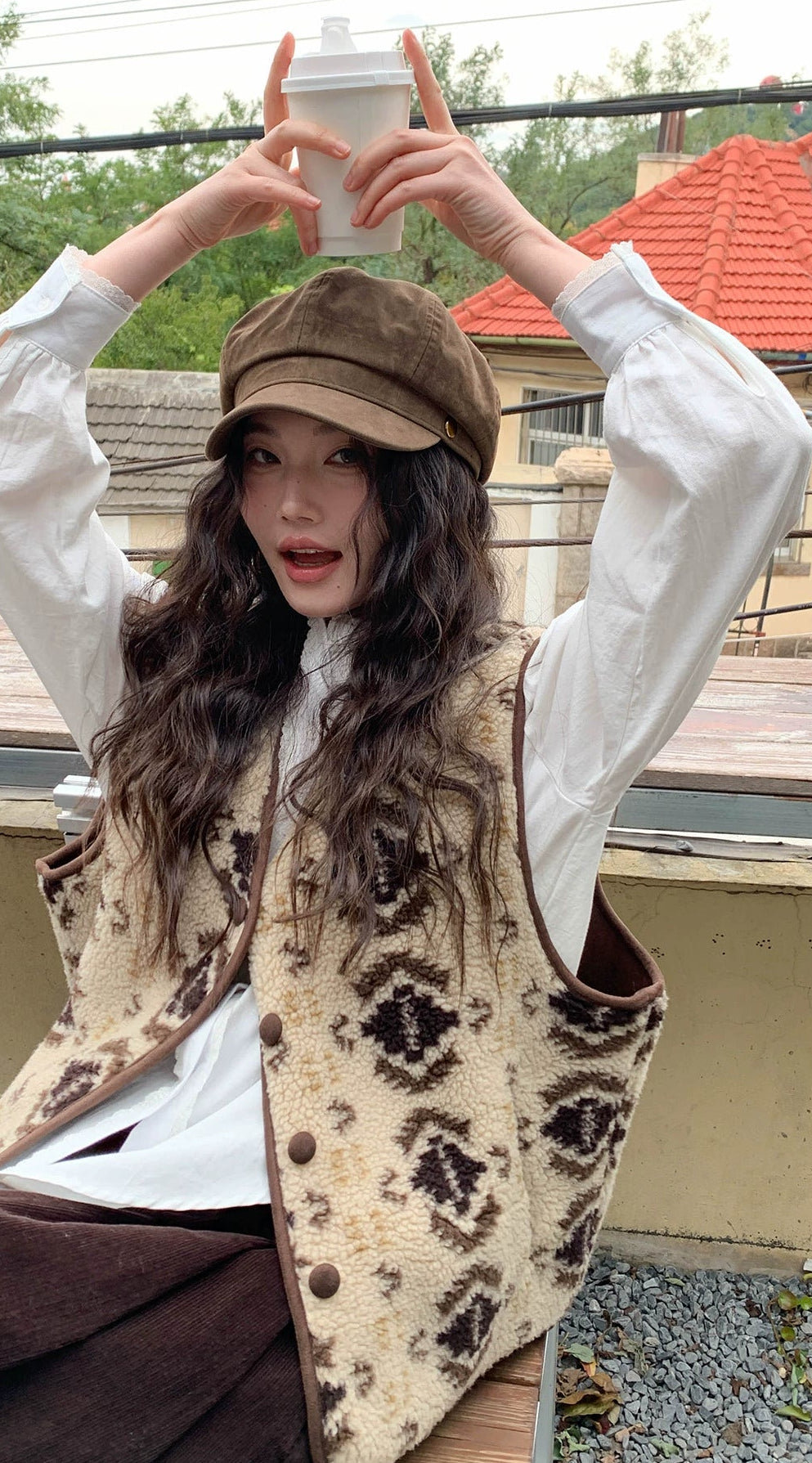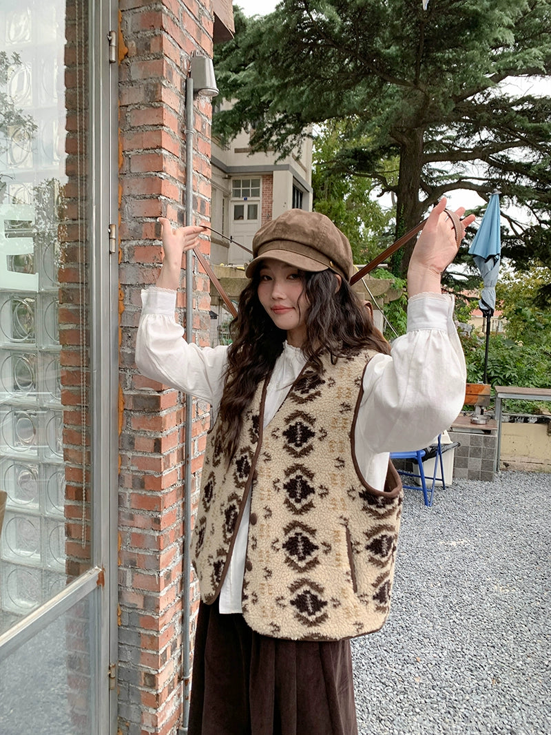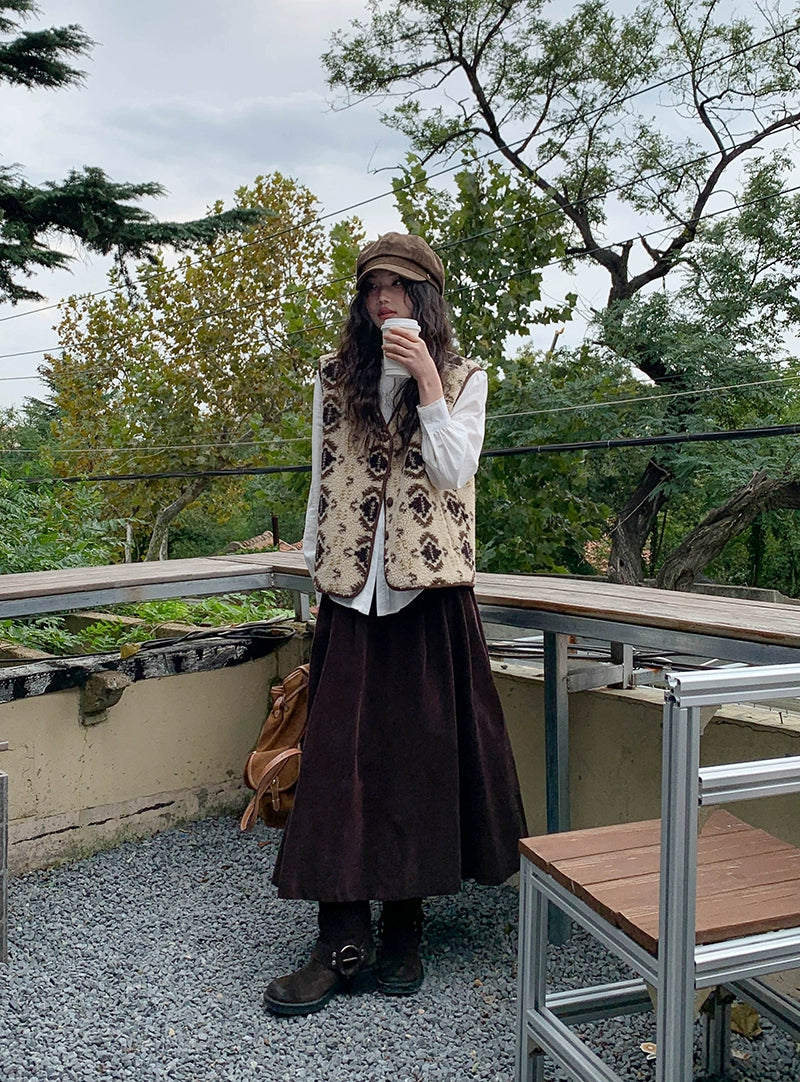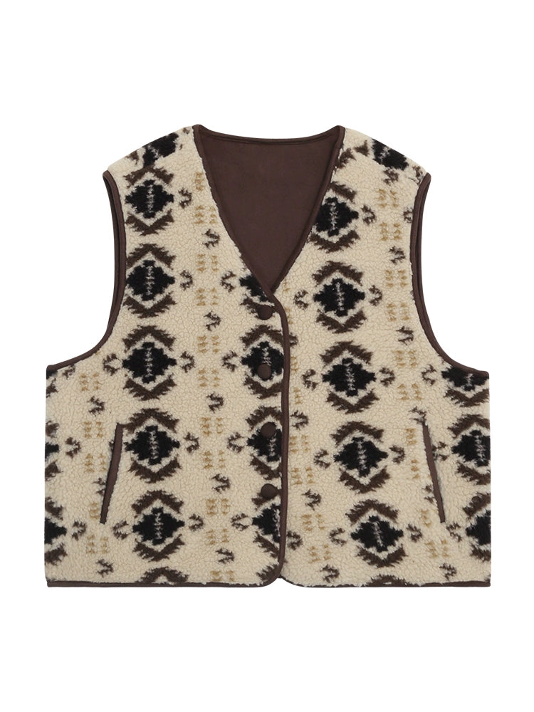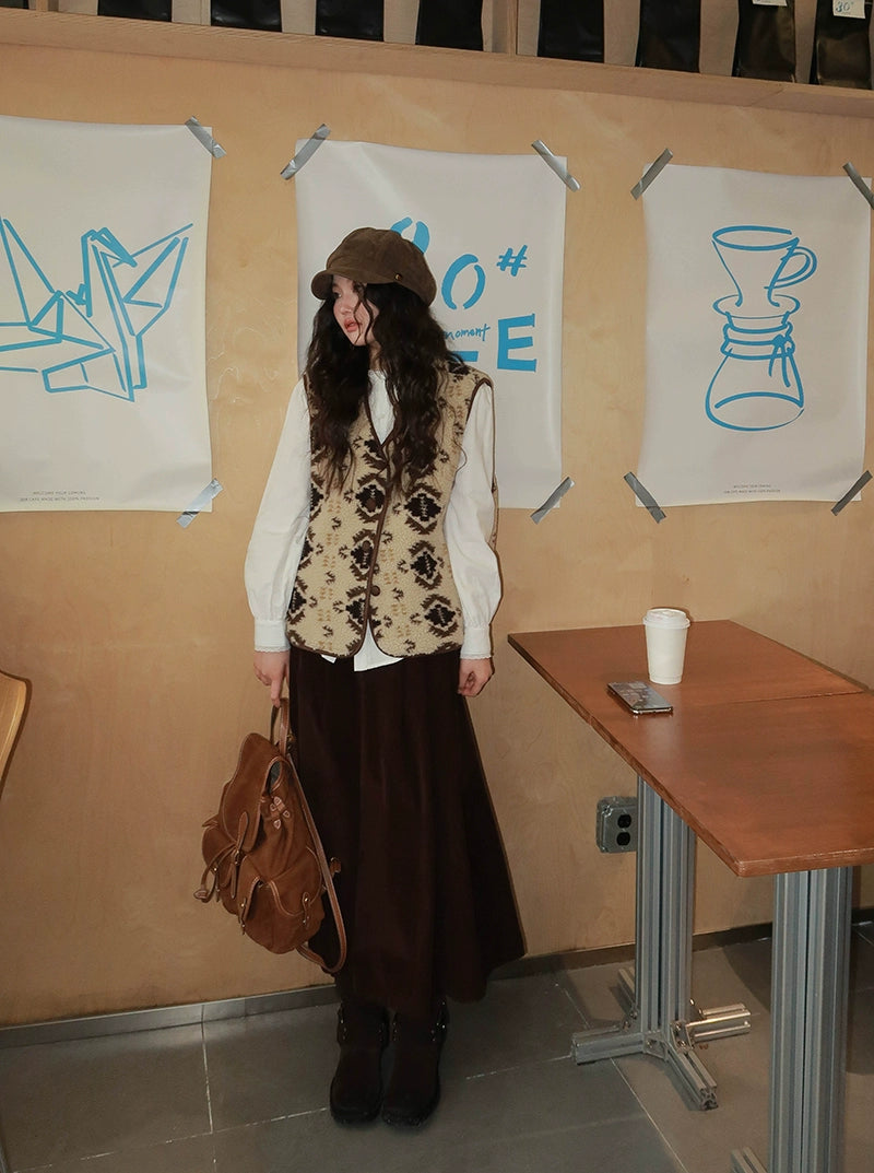 柔らかなウール素材に独特のフェアアイル模様が施されたベストコート。温かみのあるクリーム色とコントラストの効いたブラウンが特徴的で、カジュアルでもフォーマルでも合わせやすいデザイン。ボタンやポケットなどのディテールが魅力を引き立て、日常のシーンやお出かけにぴったり。