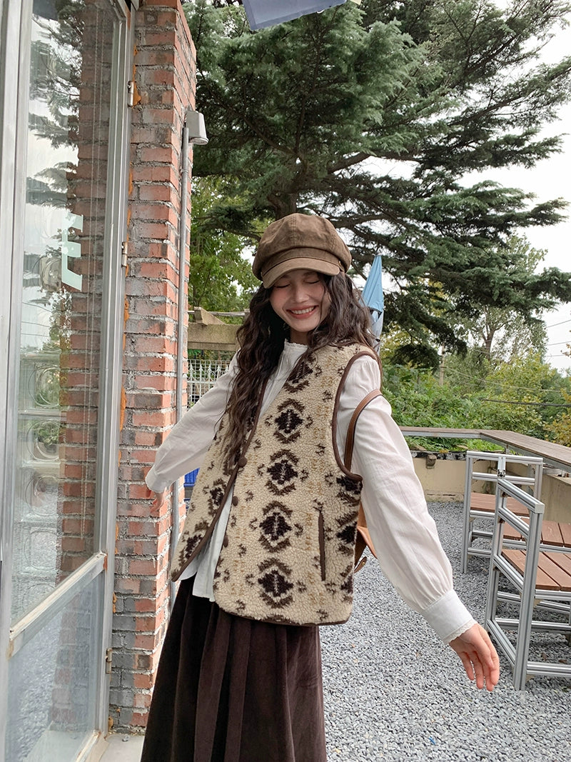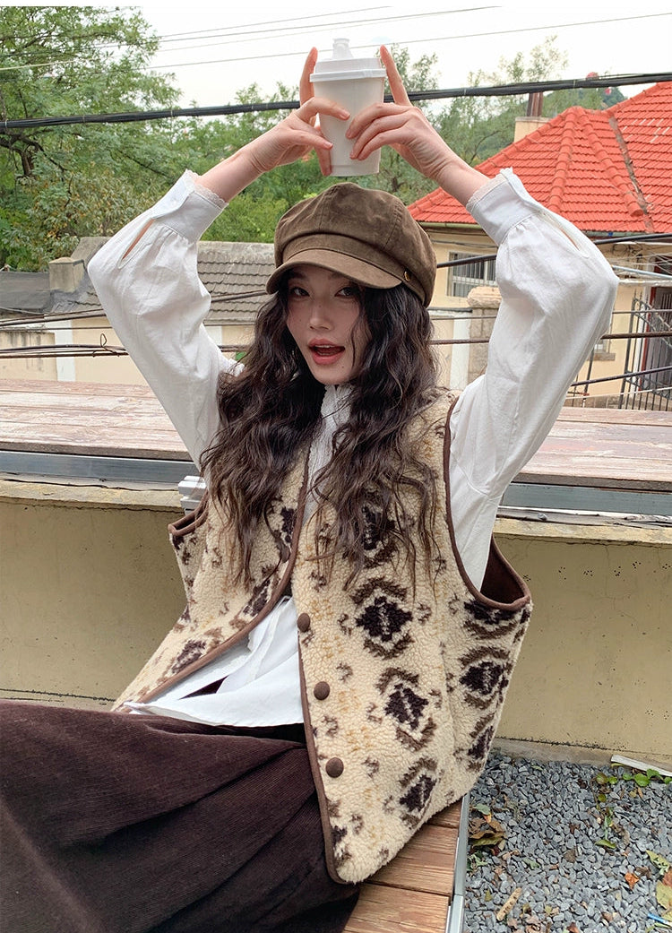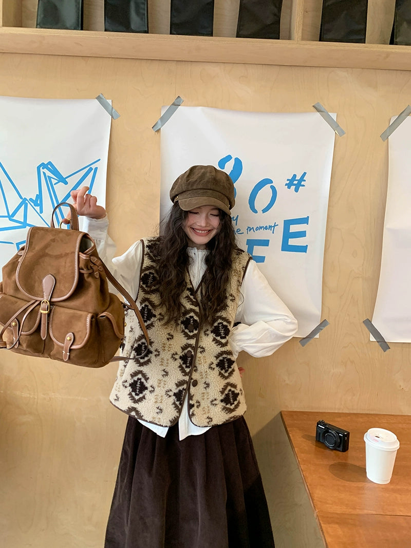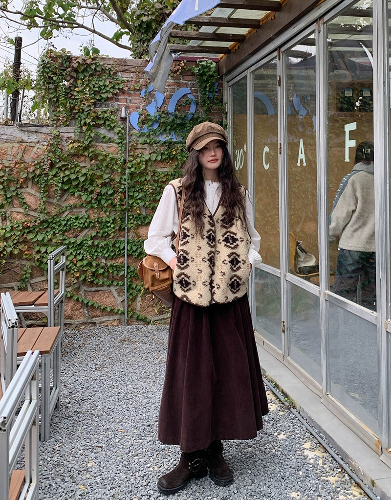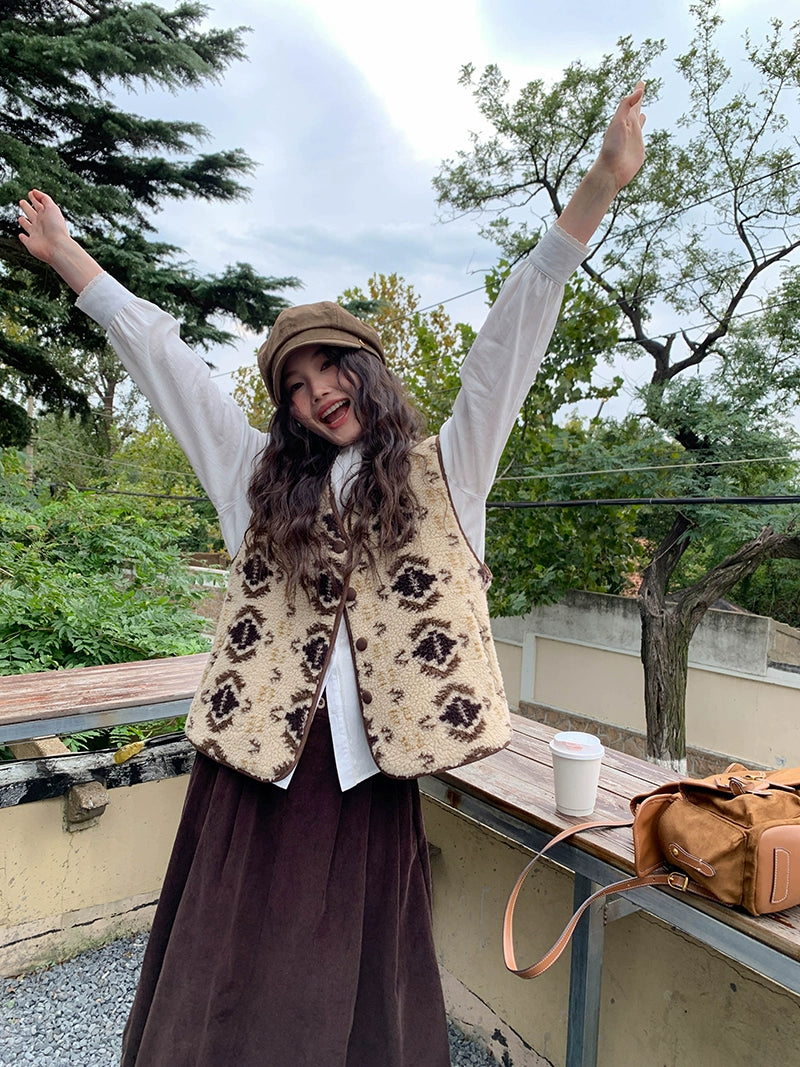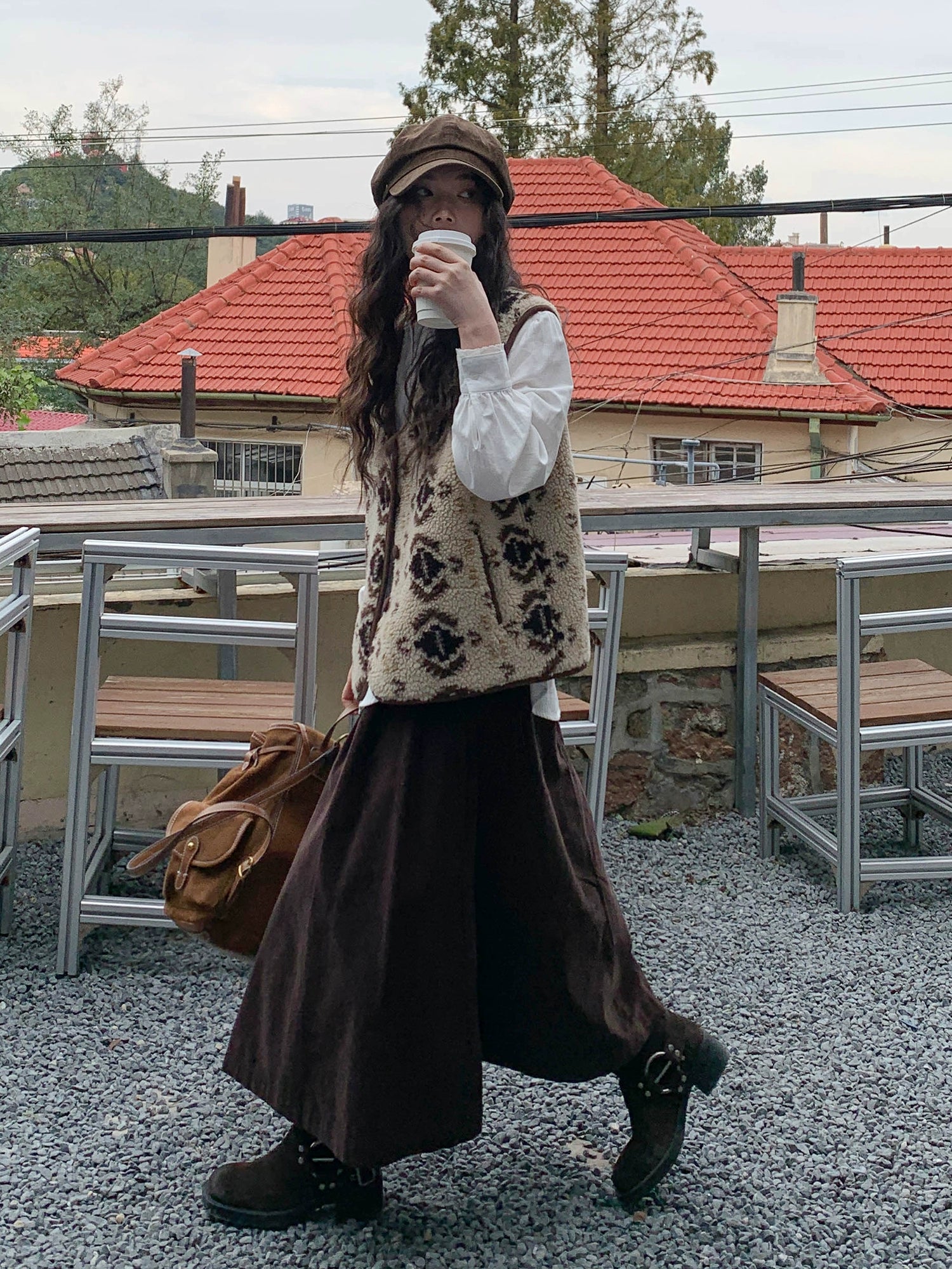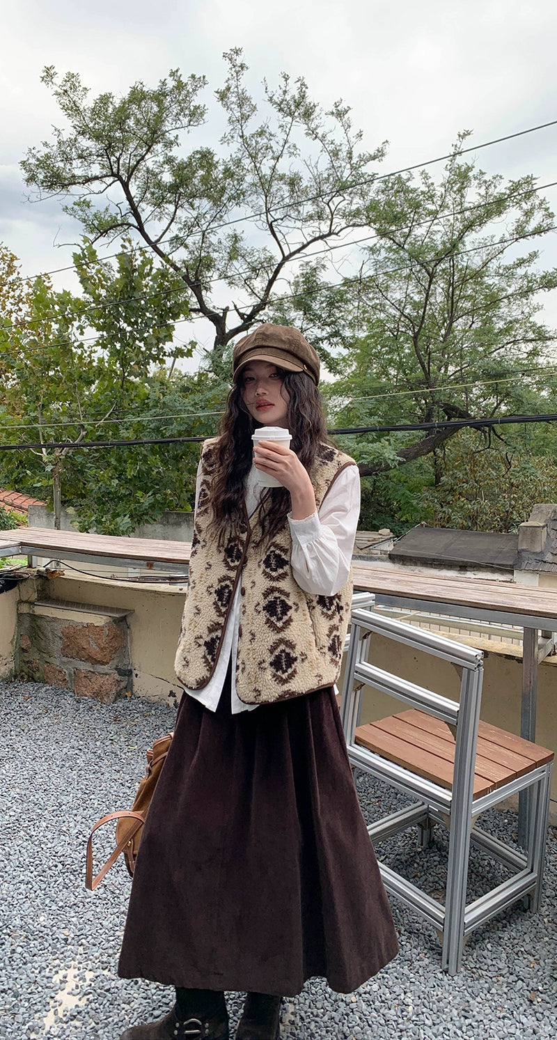 柔らかなウール素材に独特のフェアアイル模様が施されたベストコート。温かみのあるクリーム色とコントラストの効いたブラウンが特徴的で、カジュアルでもフォーマルでも合わせやすいデザイン。ボタンやポケットなどのディテールが魅力を引き立て、日常のシーンやお出かけにぴったり。