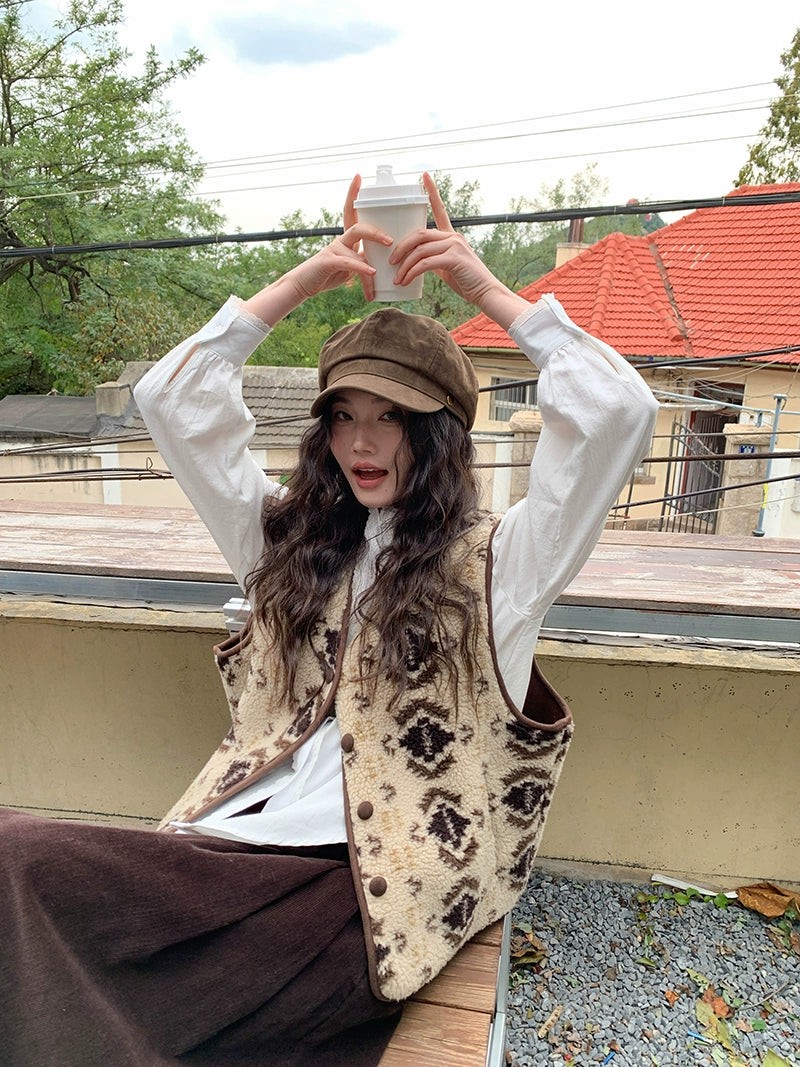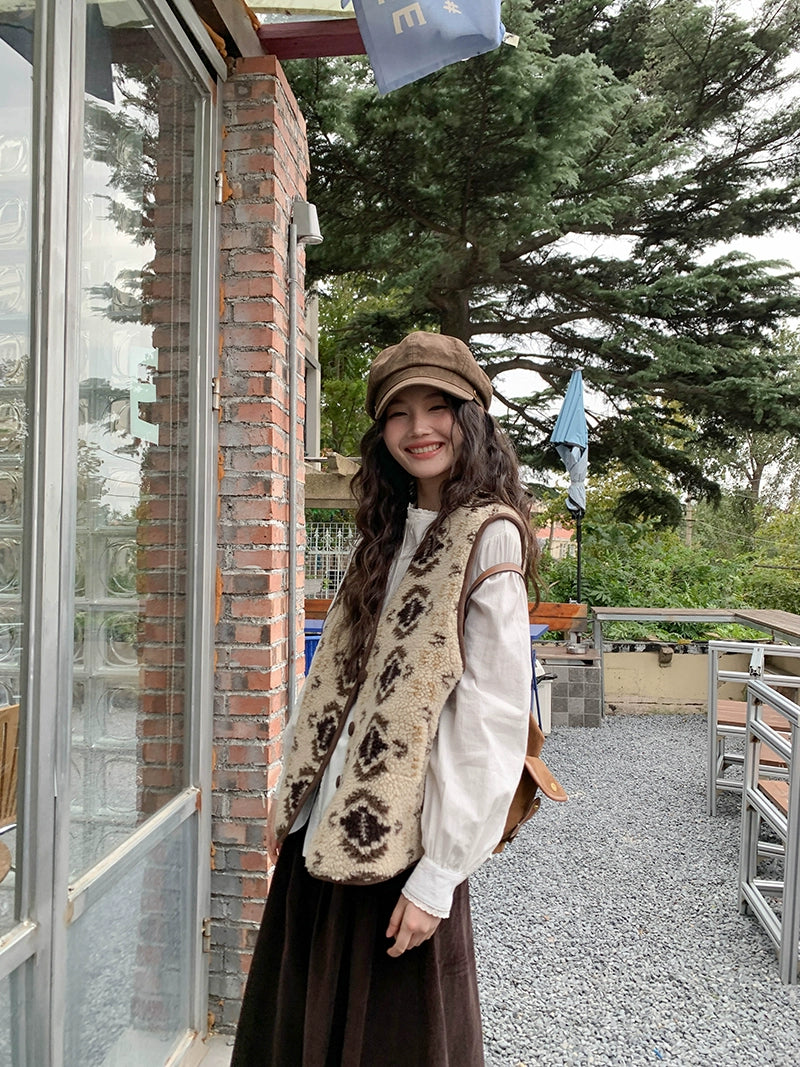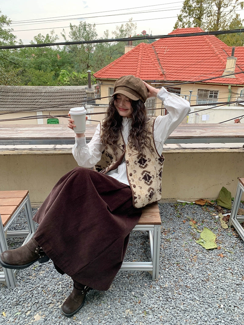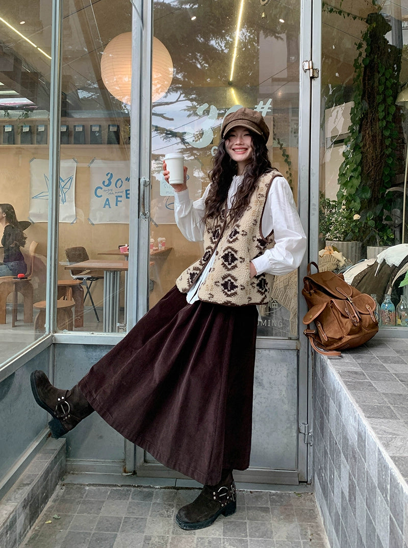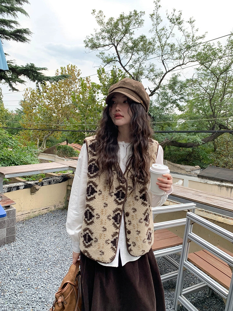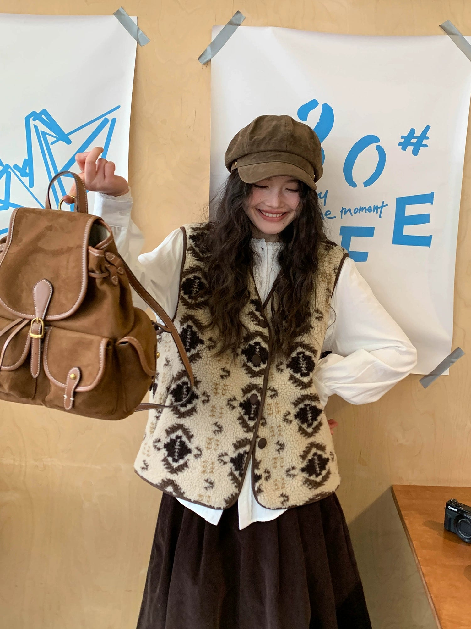 柔らかなウール素材に独特のフェアアイル模様が施されたベストコート。温かみのあるクリーム色とコントラストの効いたブラウンが特徴的で、カジュアルでもフォーマルでも合わせやすいデザイン。ボタンやポケットなどのディテールが魅力を引き立て、日常のシーンやお出かけにぴったり。