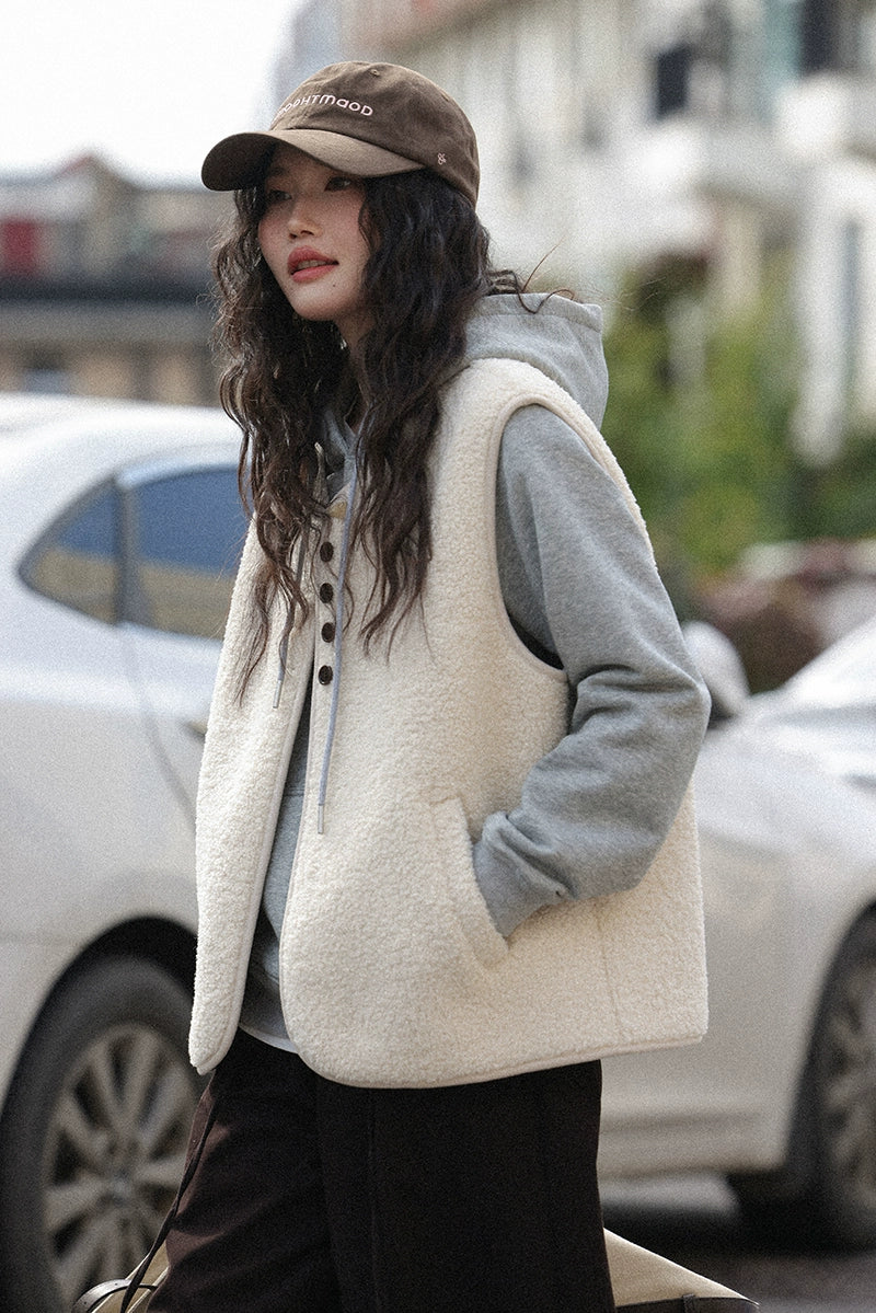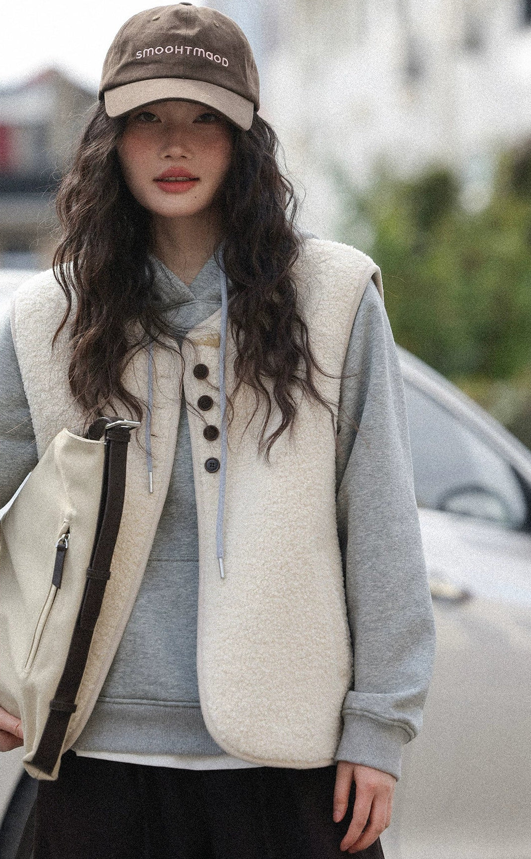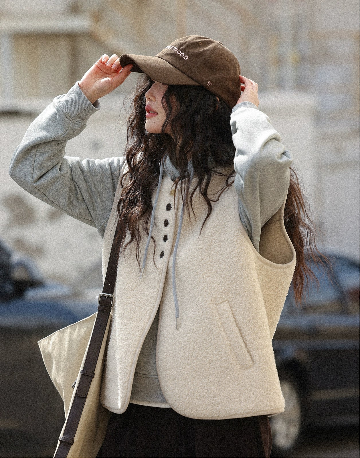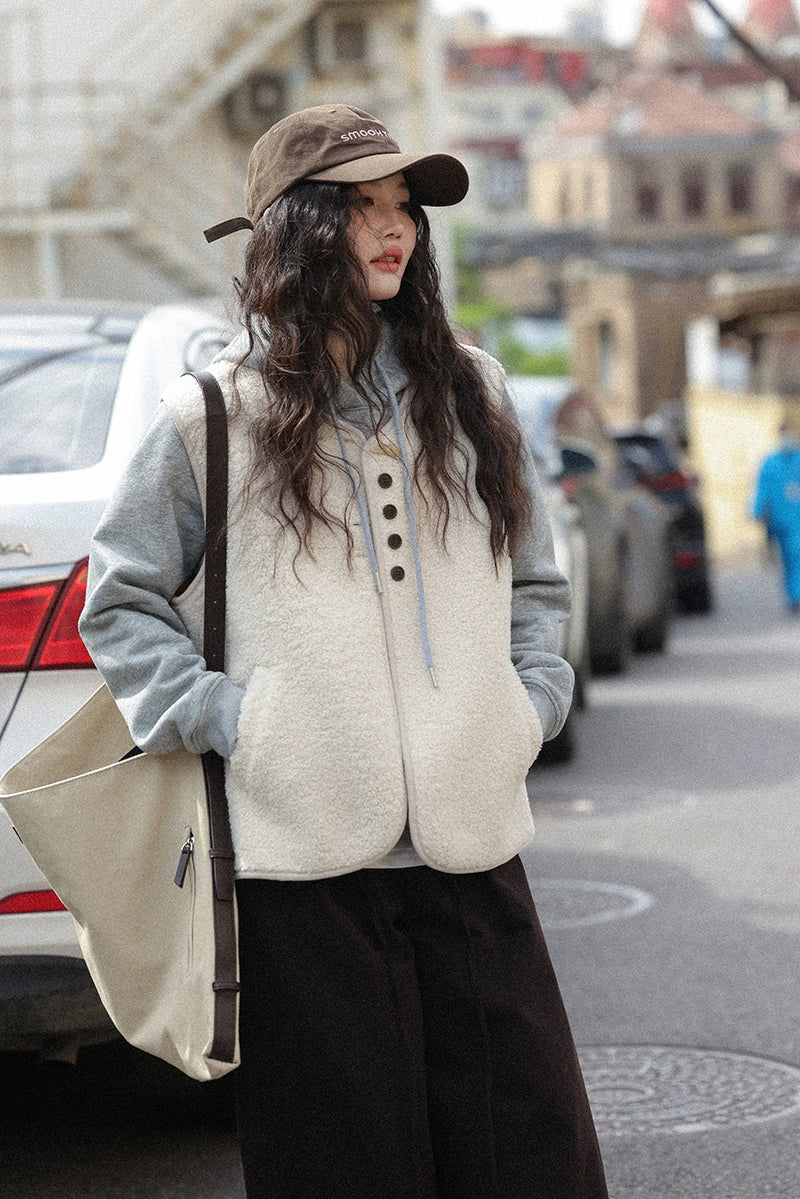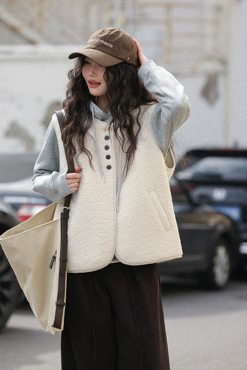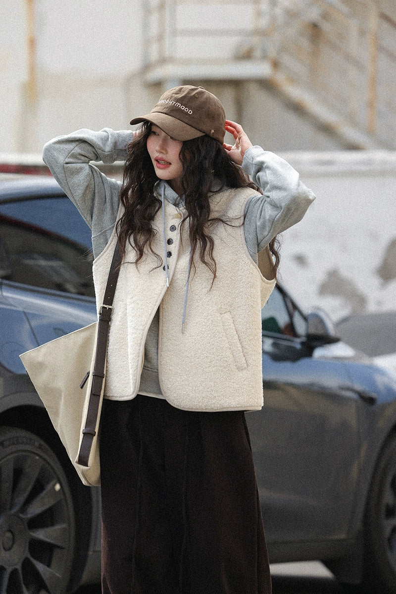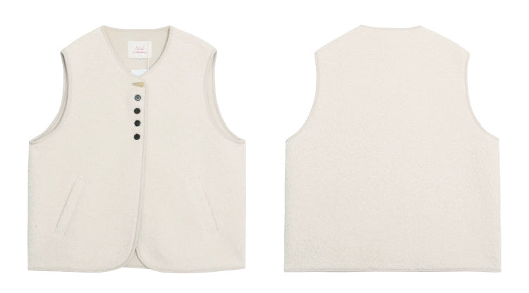 柔らかな質感のフェイクファー素材が特徴のレイヤードウールベスト。淡いクリーム色にシンプルなボタンデザイン、ゆったりとしたシルエットでカジュアルにもフォーマルにも使えます。スウェットと合わせることでリラックスしたスタイルを演出し、春秋のデイリールックにぴったりです。