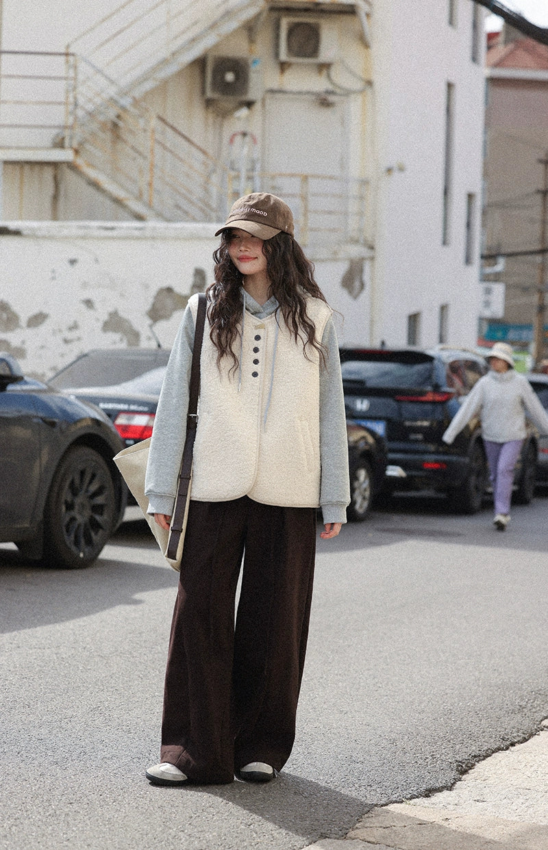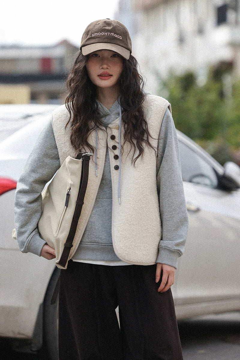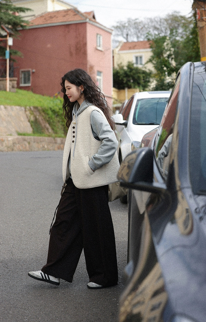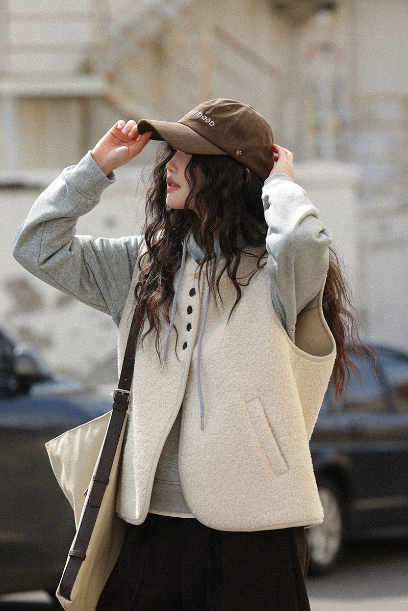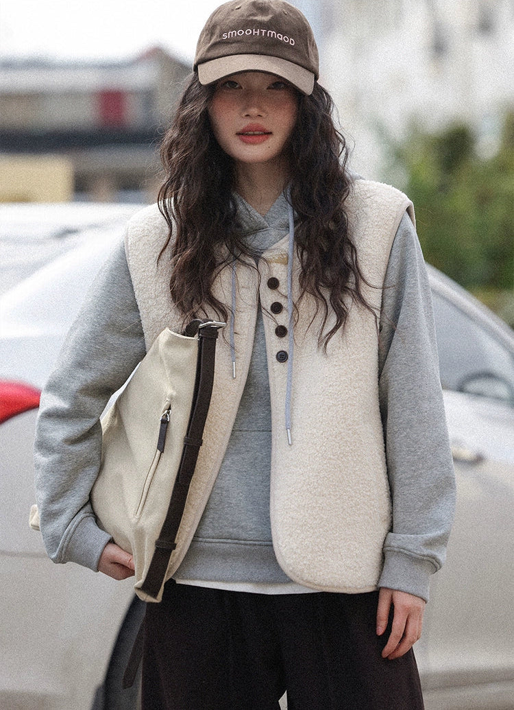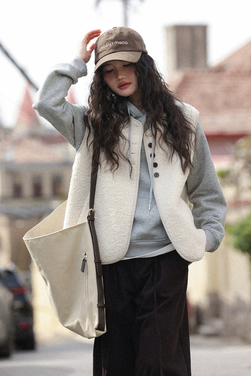 柔らかな質感のフェイクファー素材が特徴のレイヤードウールベスト。淡いクリーム色にシンプルなボタンデザイン、ゆったりとしたシルエットでカジュアルにもフォーマルにも使えます。スウェットと合わせることでリラックスしたスタイルを演出し、春秋のデイリールックにぴったりです。