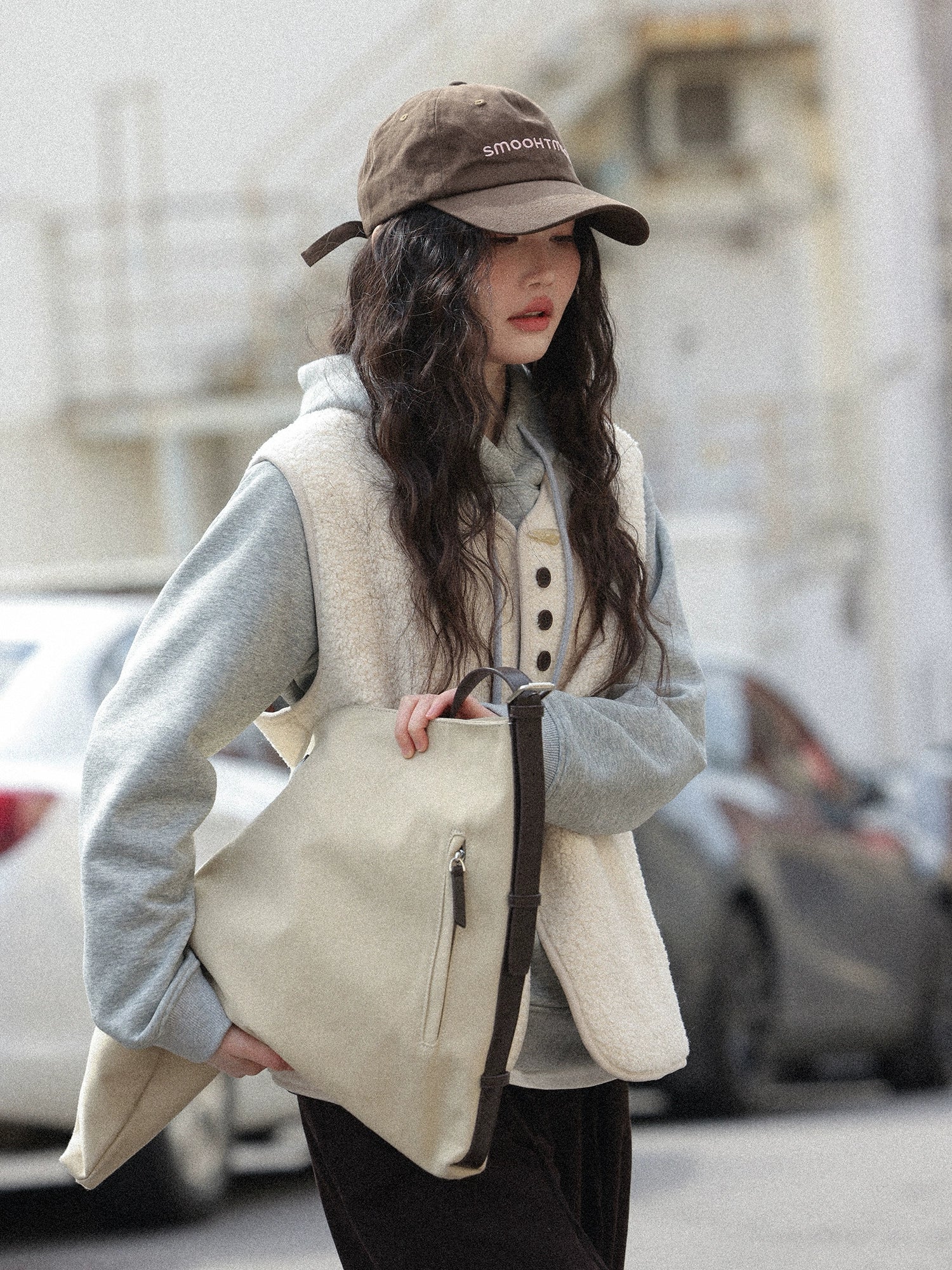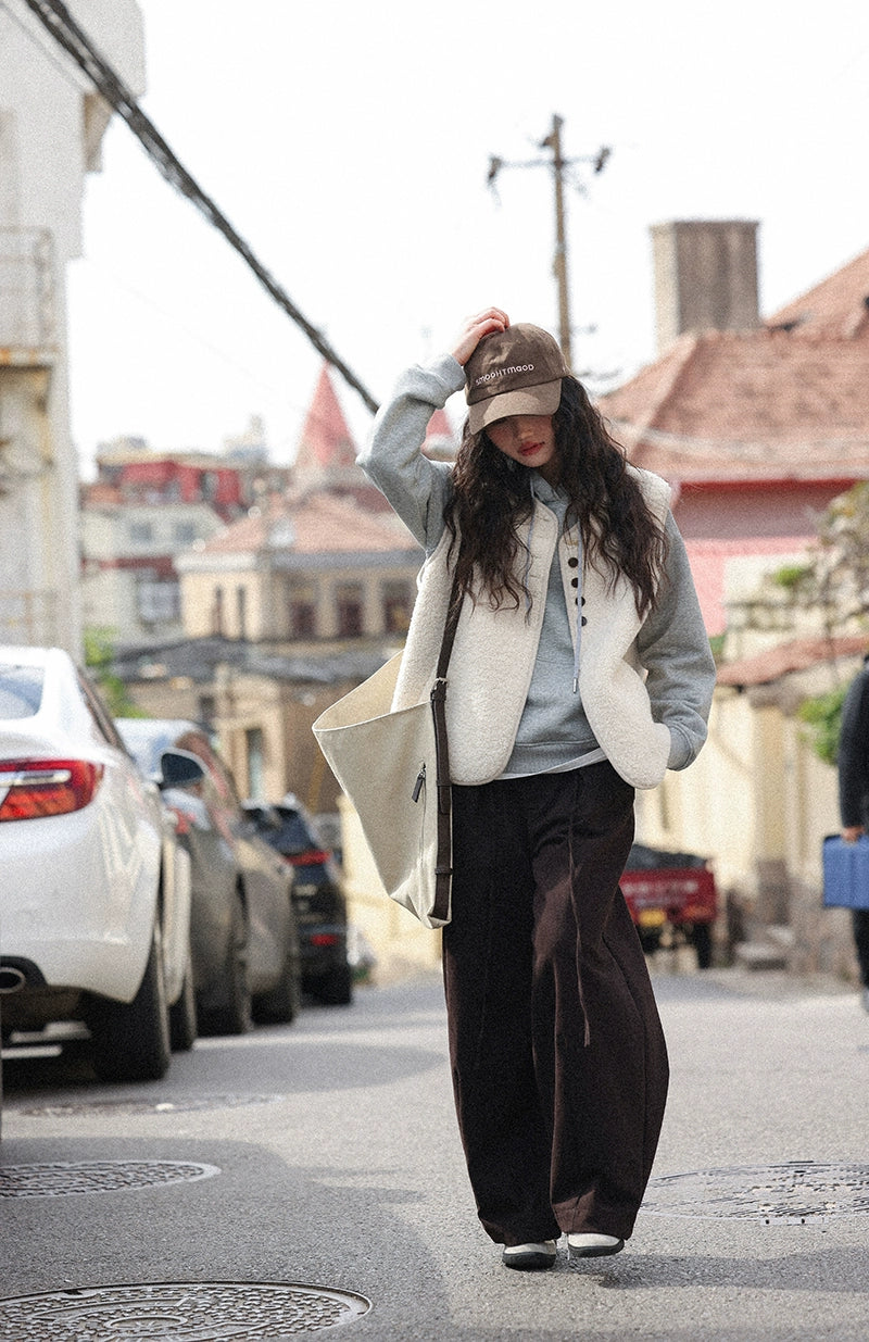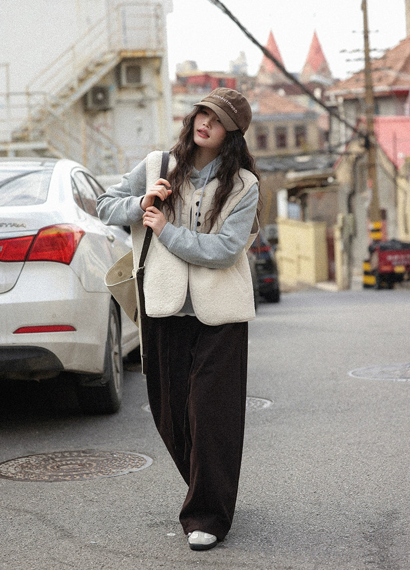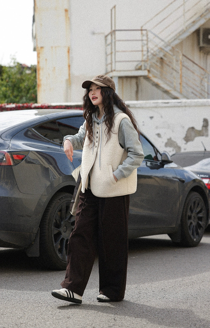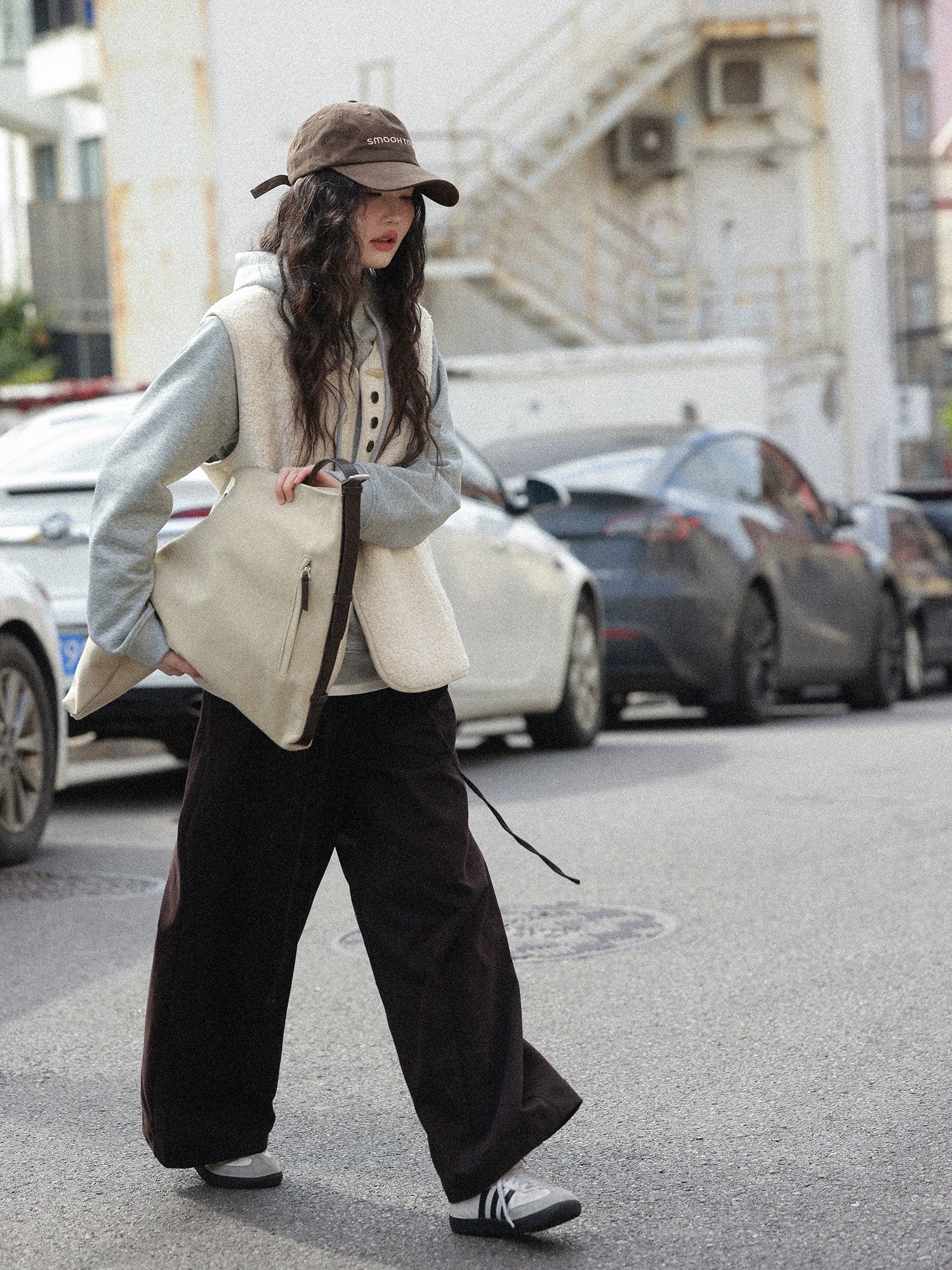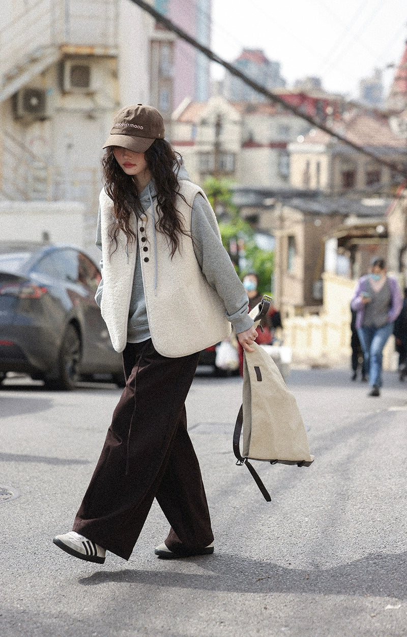 柔らかな質感のフェイクファー素材が特徴のレイヤードウールベスト。淡いクリーム色にシンプルなボタンデザイン、ゆったりとしたシルエットでカジュアルにもフォーマルにも使えます。スウェットと合わせることでリラックスしたスタイルを演出し、春秋のデイリールックにぴったりです。
